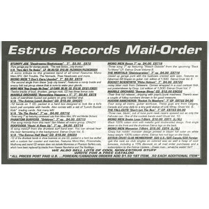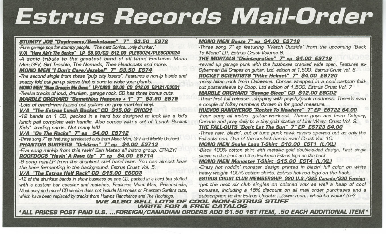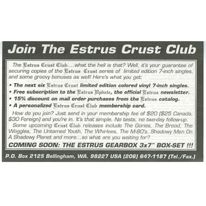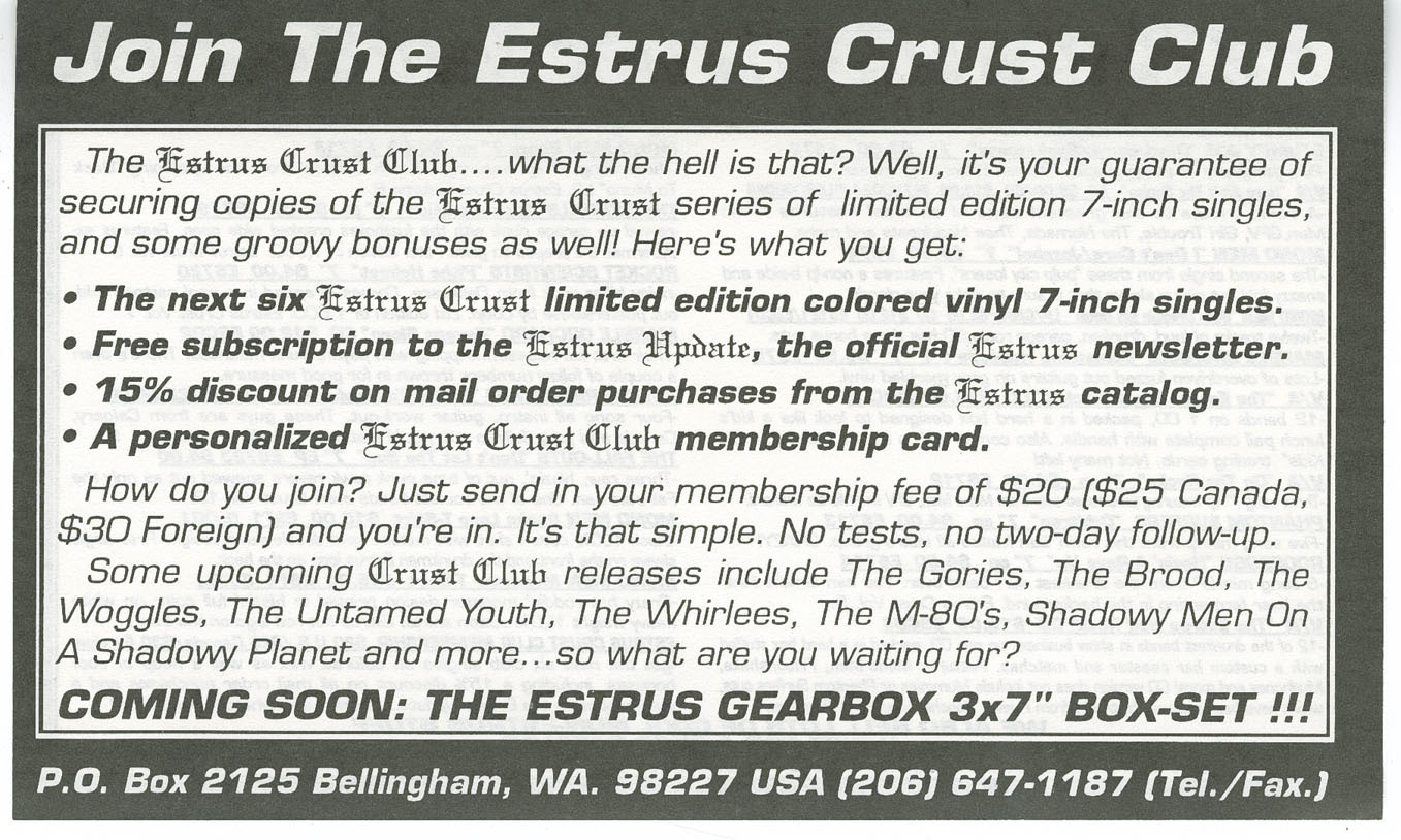 Issued as volume 9 in the Estrus Crust EP series. Copies sold through Estrus mail order included a red-and-white oval vinyl sticker with the band’s name. All runout markings are hand-etched, with “Kdisc” stamped on both sides