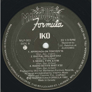 This coveted album by minimal synth aficionados around the globe has been out of print and very rare since it’s original release in 1982. Hailing from Montreal, Canada, IKO has always been shrouded in mystery. All 3 members come from an academic background (electroacoustic composition, etc), and they met at the University of Montreal in the music department. Taking from their collective influences of 60’s pop, prog and minimalist composers as well as early industrial, they played in a few early bands before solidifying the all-synth incarnation of IKO in it’s definitive lineup. The LP was originally released on Manhattan Formula. Other than Rational Youth, the Montreal synth scene was small, and the band broke up not too long after it’s release. Over the years, it has slowly achieved cult status of the highest order and now fetches inflated collector’s prices on the open market. It even prompted an unauthorized bootleg LP a few years ago (of much inferior sound quality). “Approach On Tokyo” sets the mood with it’s electro hooks and almost “Trans-Europe Express” synth parts. “Gonadotropic Synthesis” is an amazing slow and beautiful synthy melodic number which blurs the lines between love song and a lecture on hormonal interplay out of a medical textbook”. “Digital Delight” is a fast paced dance floor favorite with cyborg lyrics and catchy hooks.