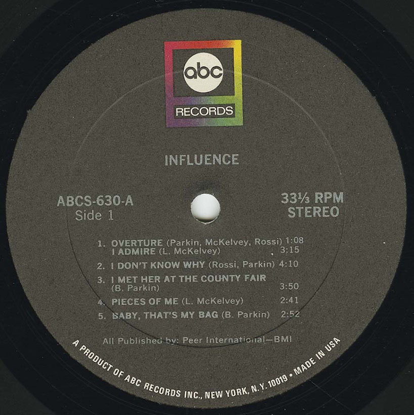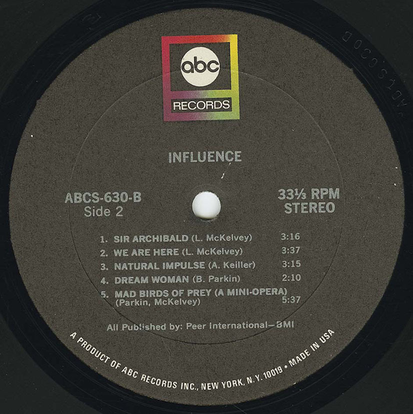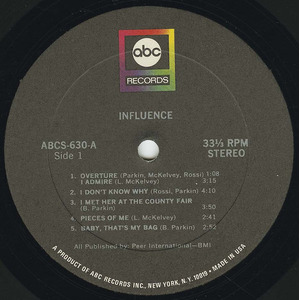 In late 1967, the band sent a demo tape to producer Dennis Minogue at ABC Records in New York and subsequently recorded a lone album on four-track that was issued early the following year. "Influence" is a startling piece of music and clearly shows how unique the band was. However, it didn't sell well and is now something of a collector's item. The highlights include the chanson styled "I Don't Know Why", composed by Rossi and Island, and heavier pieces like McKelvey's "Natural Impulse" and "Pieces of Me", the latter co-written with Andy Keiller.