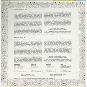 For it's second album, L'Infonie recorded Walter Boudreau's arrangement of Terry Riley's landmark piece for wind ensemble "In C," here re-titled "Mantra." Boudreau modified it in order to fit L'Infonie's possibilities, but he also added a rhythm section. Therefore, this is the grooviest version of "In C" ever recorded. The bass (electric) and drums support the piano's pulsation, while an assortment of percussion instruments are used to punctuate events as they happen in order to give the piece relief. Riley's score is made of 53 short events placed on a pulsation. Each player has to move from the first to the second to the third, etc., until he reaches number 53, but he can repeat each of them as many times as he wants. Therefore, the piece evolves through some kind of osmosis. This impression is very palpable in L'Infonie's interpretation. The studio they recorded in was using 30-minute tape reels, so the album fades out around number 48. In the liner notes, Boudreau announced the remaining part would be released on a future L'Infonie record, but that promise was never fulfilled.