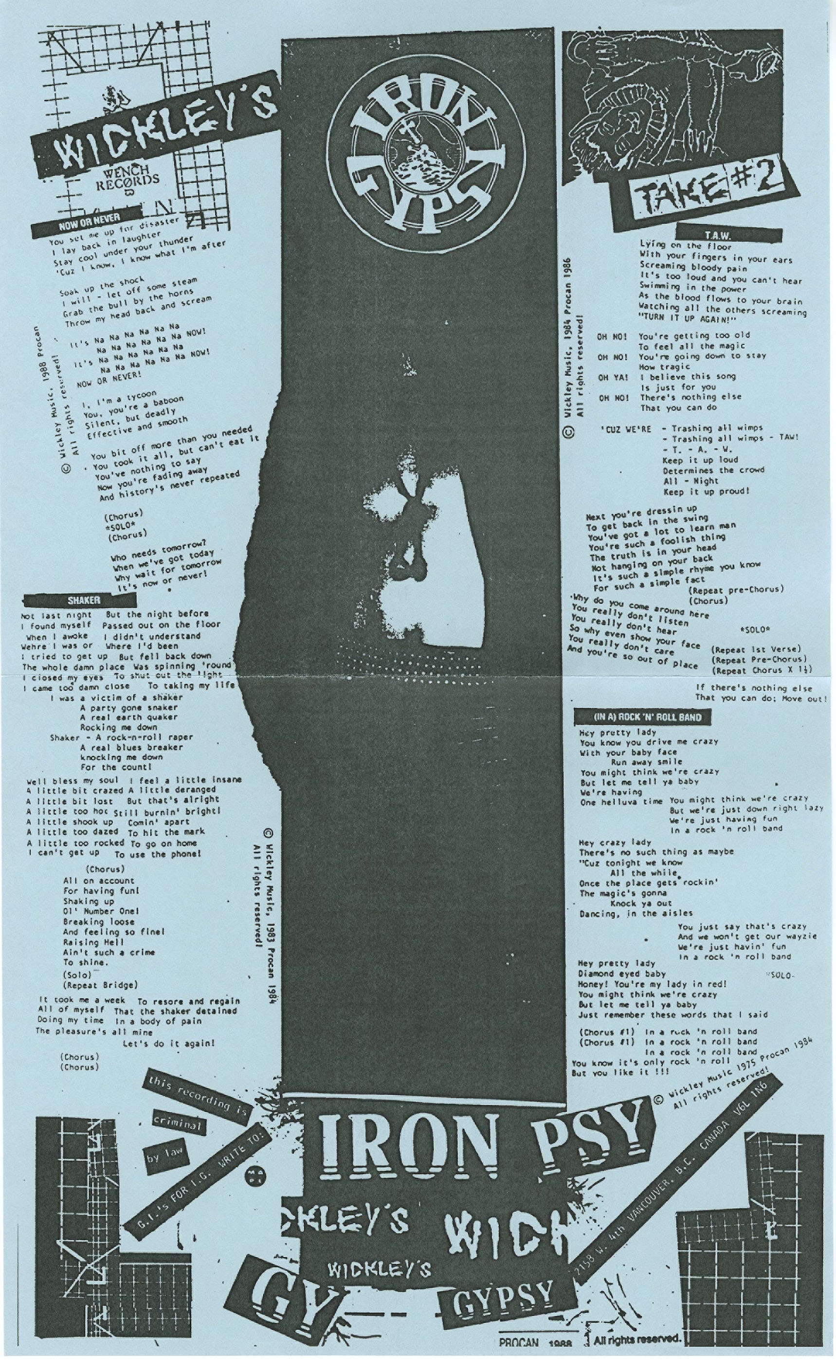 IRON GYPSY was formed in Hamilton, Ontario 1983. The members then were Ed 'Breaker' Zern on drums, and Glenn Harder on bass and vocals. I met these two fine musicians while I was living in Edmonton, Alberta. I played in a bar band called X-Static with them. Domestic issues around general survival dissolved that line-up, while in Hamilton. Neither of us had studio experience at that time, but we did have plenty of 'live'. I moved back to Edmonton, their home, to re-form, but both were committed to other projects, so I continued on to Vancouver, a city with more to offer, so I thought. I set myself up with a job... bought a Teac 4 track recording machine, and proceeded to get the songs out of my head.