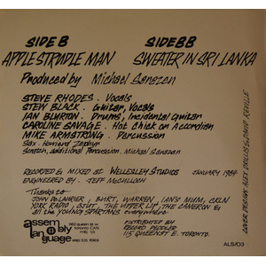 Rhodes and Black then recruited Ian Blurton and Mike Armstrong of Change of Heart and Caroline Savage of Fifth Column to appear on a rerecording of "Apple Strudel Man", which was released as a 7" single in 1984 with the B-side "Sweater in Sri Lanka". The single's video, released the very same week as MuchMusic's initial launch, was added to MuchMusic's rotation; the single was also a hit on Toronto's alternative music station CFNY-FM.