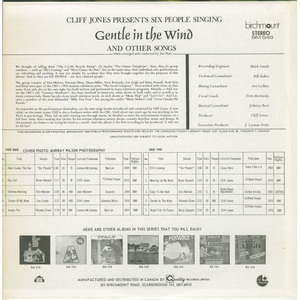 As impressive as the performances themselves, are the new songs herein introduced and composed by Cliff Jones. A new talent on the music scene, Cliff is also a freelance writer with the CBC. Until about two years ago he was working on his Ph.D. in psychology. Then, fed up with running rats through mazes, he decided to enter the entertainment business on a full time basis. Since making that choice, he has written television variety shows, comedy sketches, music and drama. At the moment, he claims to be trying his hand at a novel! And this album is the first recording he has produced. It will not be his last!