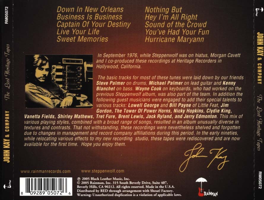 1997—This John Kay solo release was recorded in 1976 but was shelved and forgotten due to changes in record label affiliation. It featured guest performances by Lowell George & Bill Payne (of Little Feat), Nicky Hopkins and the Tower of Power Horns, among others. A mix of various styles and a broad range of songs make this record unusually rich in musical textures and contrasts. Songs: Down In New Orleans, Business is Business, Captain of Your Destiny, Live Your Life, Sweet Memories, Nothing But, Hey I’m Alright, Sound Of The Crowd, You’ve Had Your Fun, Hurricane Maryann.