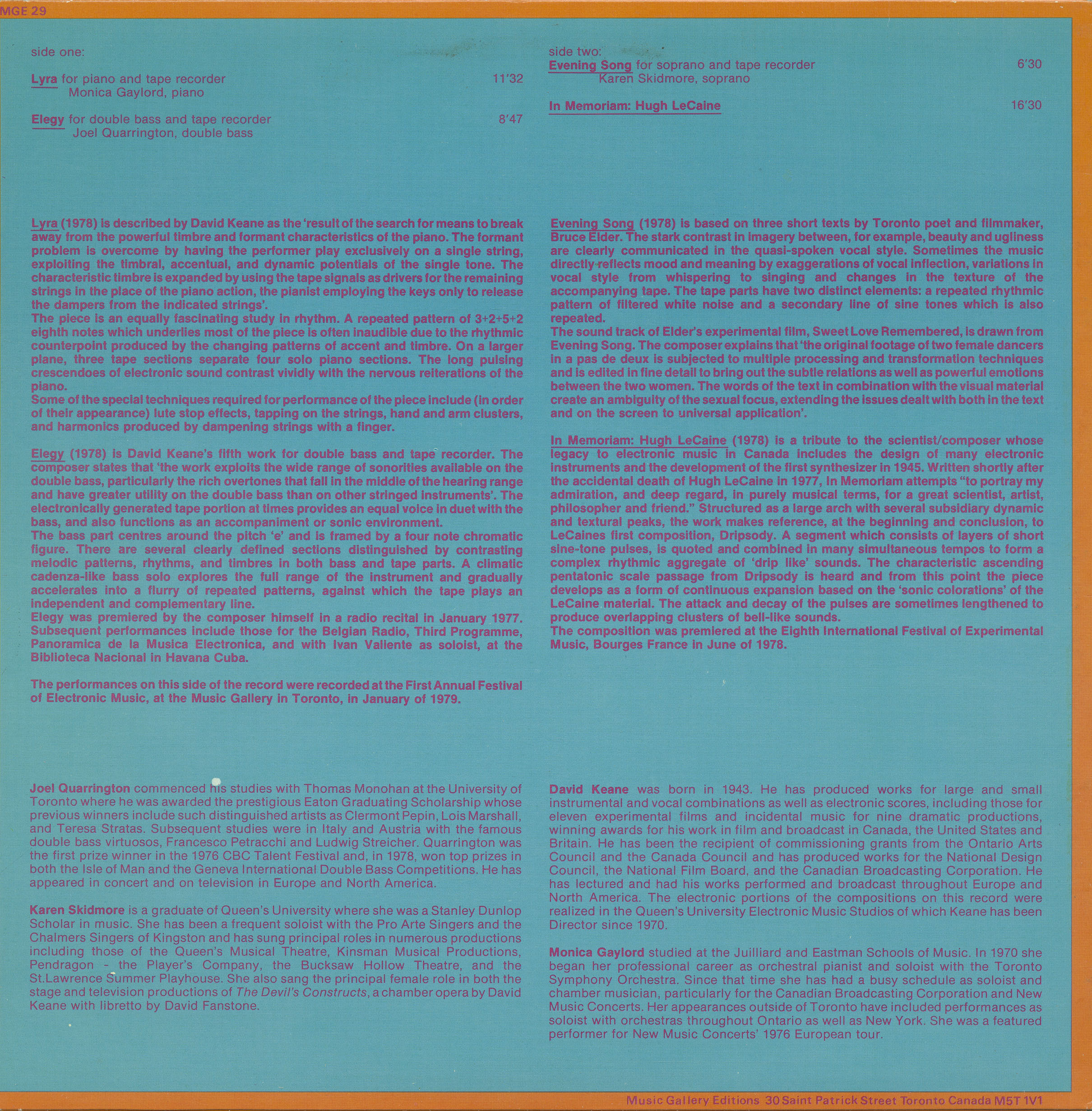 The performances on this side of the record were recorded at the First Annual Festival of Electronic Music, at the Music Gallery in Toronto, in January of 1979.