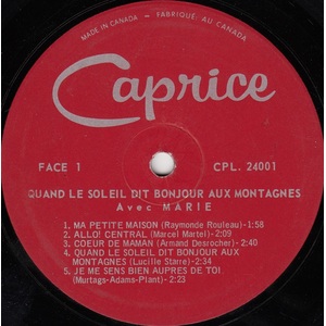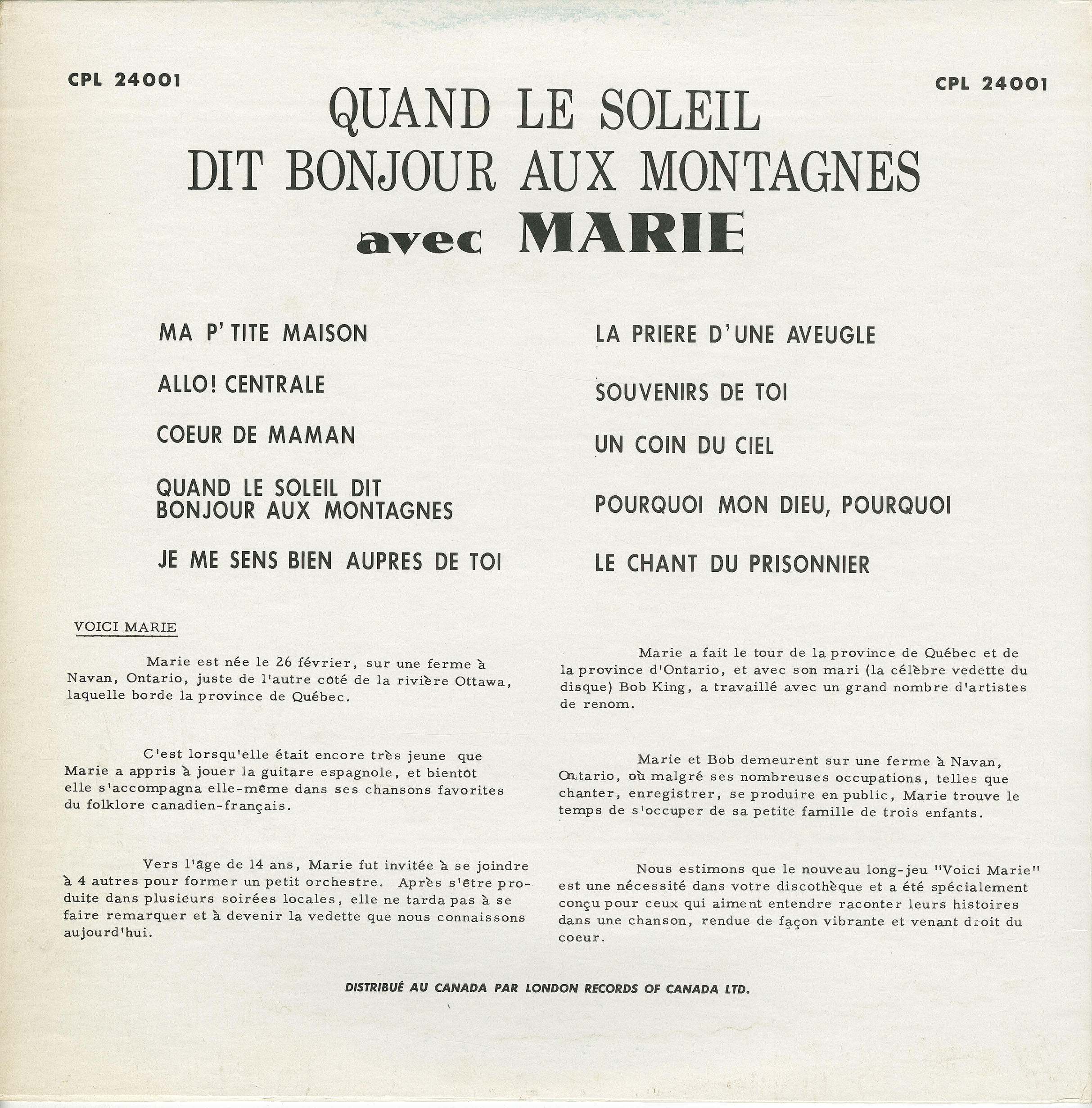 Marie King quickly became a prominent part of The Bob King Show, performing songs both in English and French. They recorded duet material, often with Marie singing French lyrics to Bob King favourites including his signature song "Laurel Lee". The couple toured extensively in Ontario and in Quebec, where Marie King quickly became a high-profile French language country recording star, releasing dozens of hit albums on the Quebec market for such labels as Trans-World, Caprice, Paysanne, Souvenir and Bonanza. Several of Marie King’s Christmas music albums as well as her "Golden Hits" and "Quand Le Soleil Dit Bonjours Aux Montagnes" albums were all certified Gold-Selling albums. Marie King was also a gifted songwriter, with two of her more popular hits, "Ma Petite Carole" and "Allon Mon Petit Bobby", both inspired by her children. Meanwhile, husband Bob King was enjoying similar success with songs like "My Petite Marie" and "French Canadian Girl", both inspired by his wife, Marie King.