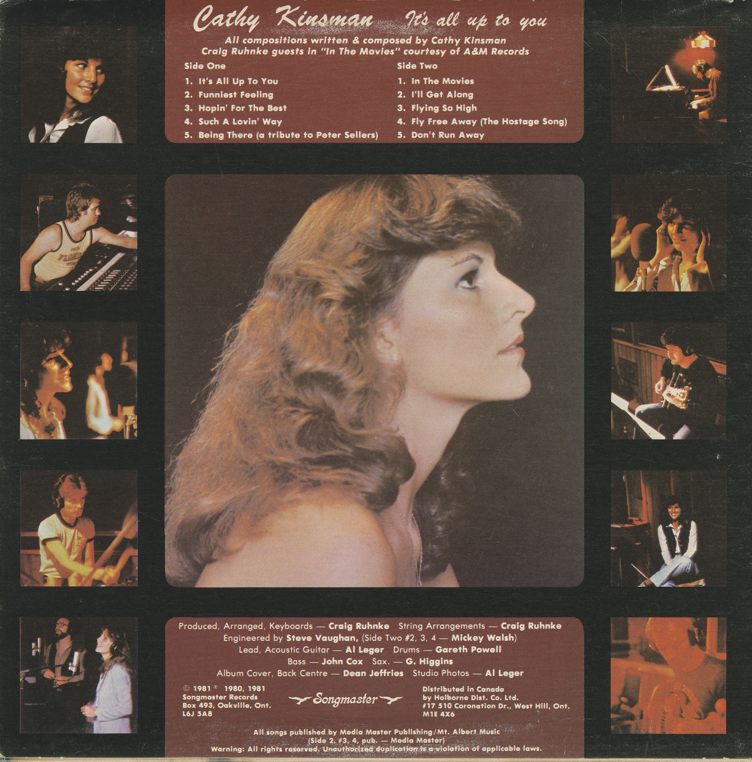 Her transition into recording came at the start of the 1980s through Songmaster Records, where she released a run of singles and her debut LP, It’s All Up to You. Produced and arranged by Craig Ruhnke, the album presented Kinsman as a songwriter in full control of her material, working within a polished adult-contemporary and folk-rock framework. Singles from this period included ‘Flying So High,’ ‘Such A Lovin’ Way,’ ‘It’s All Up to You,’ and ‘In The Movies,’ the latter recorded as a duet with Ruhnke.