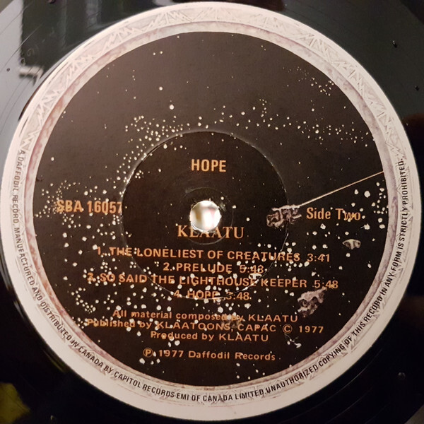 Now, hundreds of thousands of fans later, Klaatu returns with their second Capitol album, Hope, a thematically linked science fiction fantasy (Klaatu considers it the second chapter of the story begun on the first album). Hope plots the course of a group of space travelers who visit the remnants of a distant planet (the same one that blew up on the first record). They had recently discovered the asteroid due to a fine, but intense shaft of light that emanated from its surface. The fragment of planet was one of the many pieces that were hurled across the universe by the holocaust that destroyed the planet Klaatu on the first album. The bits of planet formed a huge asteroid belt which came to be known as the space graveyard. The visitors discover an ancient civilization called Politzania which also was destroyed in the explosion. Yet amidst the ruins a lighthouse beams in the night manned by the only survivor of the planet, the old lighthouse keeper. The lighthouse with its laser flare (which the visitors followed to the planet) warns interstellar travelers of the impending danger of the solar reef. The keeper of the light has spent his life searching for a philosophy, prayer, or phrase that might help bring eternal peace. Klaatu sings: "When to his end the old man came, Death told him, 'You'll not die in vain'... And had we heard his parting word, we'd know that he had said... Hope."