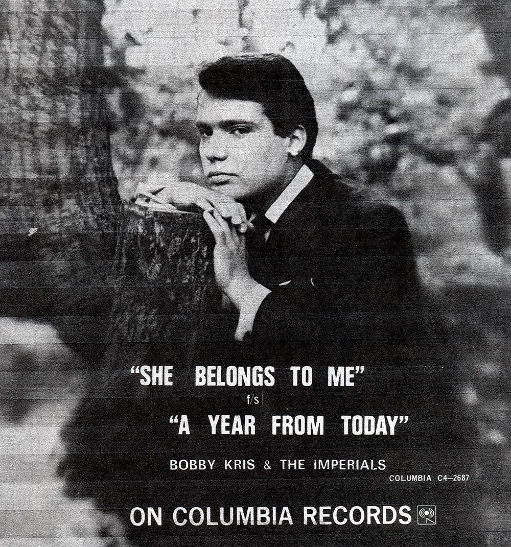 As noted earlier, the band’s two singles were recorded at one session. Bobby Kris & The Imperials’ second outing was another impressive release, coupling a cover of Bob Dylan’s “She Belongs To Me” (with an horn arrangement from Konvalinka) with Kris and Martynec’s “A Year From Today”.