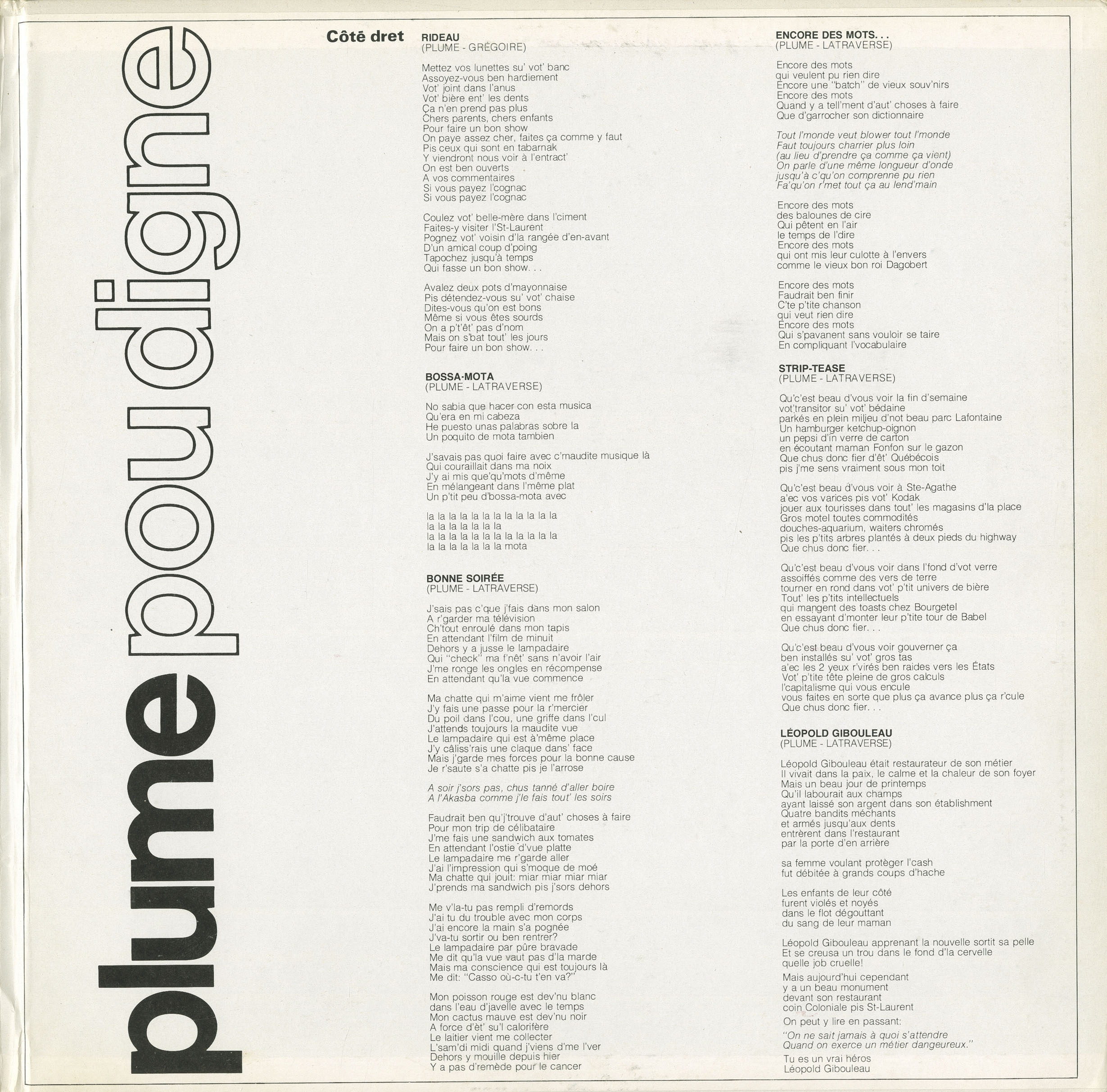 Striking out solo in 1976, Plume quickly established himself as a singular force in the Québécois music scene. Blending blues, folk, Latin, rock ’n’ roll, chanson, and spoken word, his early albums like Plume Pou Digne (1974) and Le Vieux Show Son Sale (1975) became underground landmarks. Songs like “Bobépine,” “Le Mal du pays,” and “Jonquière” struck a nerve with a generation disillusioned by mainstream media and politics. With his tangled beard, raspy delivery, and knack for vivid characters and street poetry, Plume became the voice of the anti-hero: the hitchhiker, the bum, the loner in the tavern who sees through the bullshit.