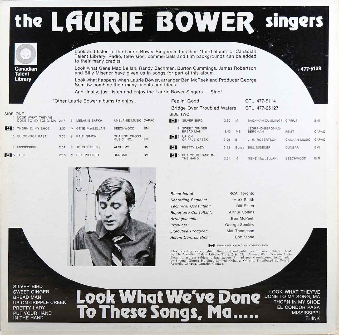 Songs written by Melanie Safka, Gene MacLellan, Paul Simon, John Phillips, Bill Misener, Randy Bachman, Burton Cummings, Michel Legrand, Alan Bergman, Marilyn Bergman, Robbie Robertson