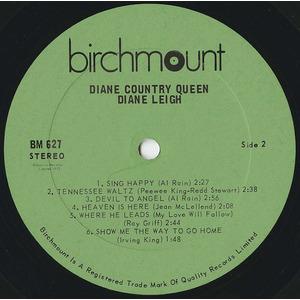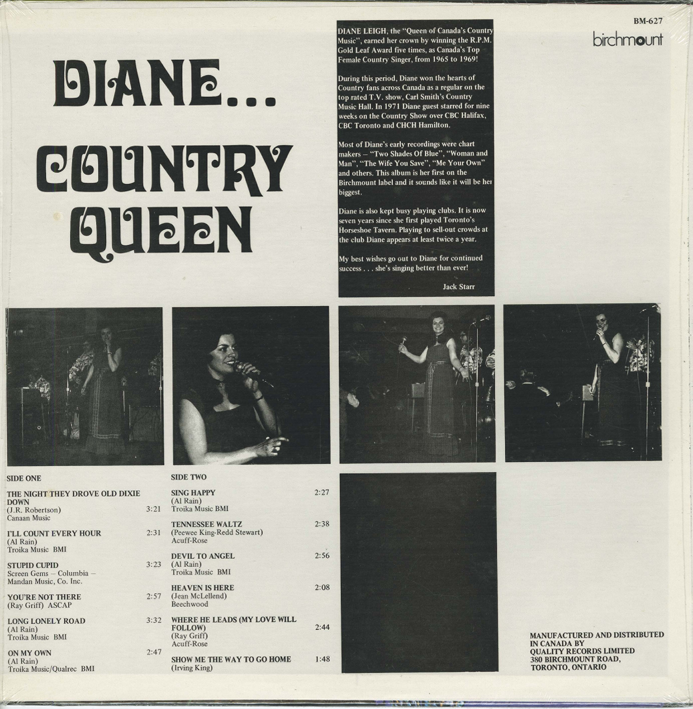 Diane Leigh, the "Queen of Canada's Country Music", earned her crown by winning the RPM Gold Leaf Award five times, as Canada's Top Female Country Singer, from 1965 to 1969! During this period, Diane won the hearts of Country fans across Canada as a regular on the top rated TV show, Carl Smith's Country Music Hall. In 1971 Diane guest starred for nine weeks on the Country Show over CBC Halifax, CBC Toronto, and CHCH Hamilton. Most of Diane's early recordings were chart makers–"Two Shades Of Blue", "Woman And Man", "The Wife You Save", "Me Your Own", and others.