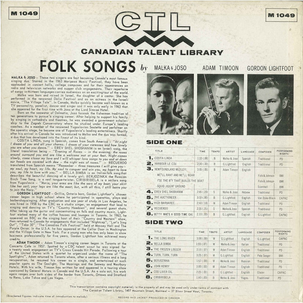 Ontario, 1960's, Folk, Early Lightfoot!, Canadian Talent Library, The Yorkville Sound