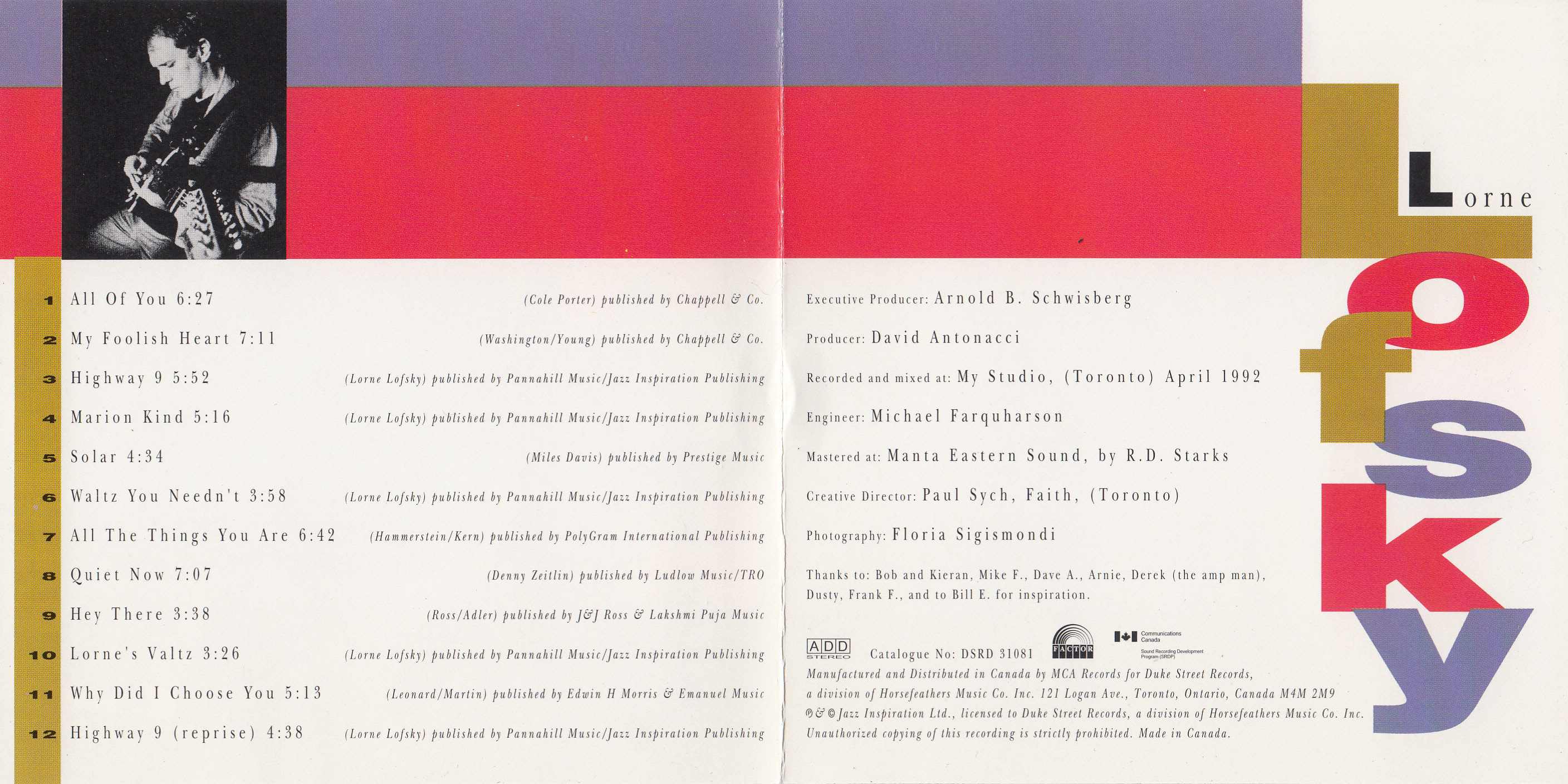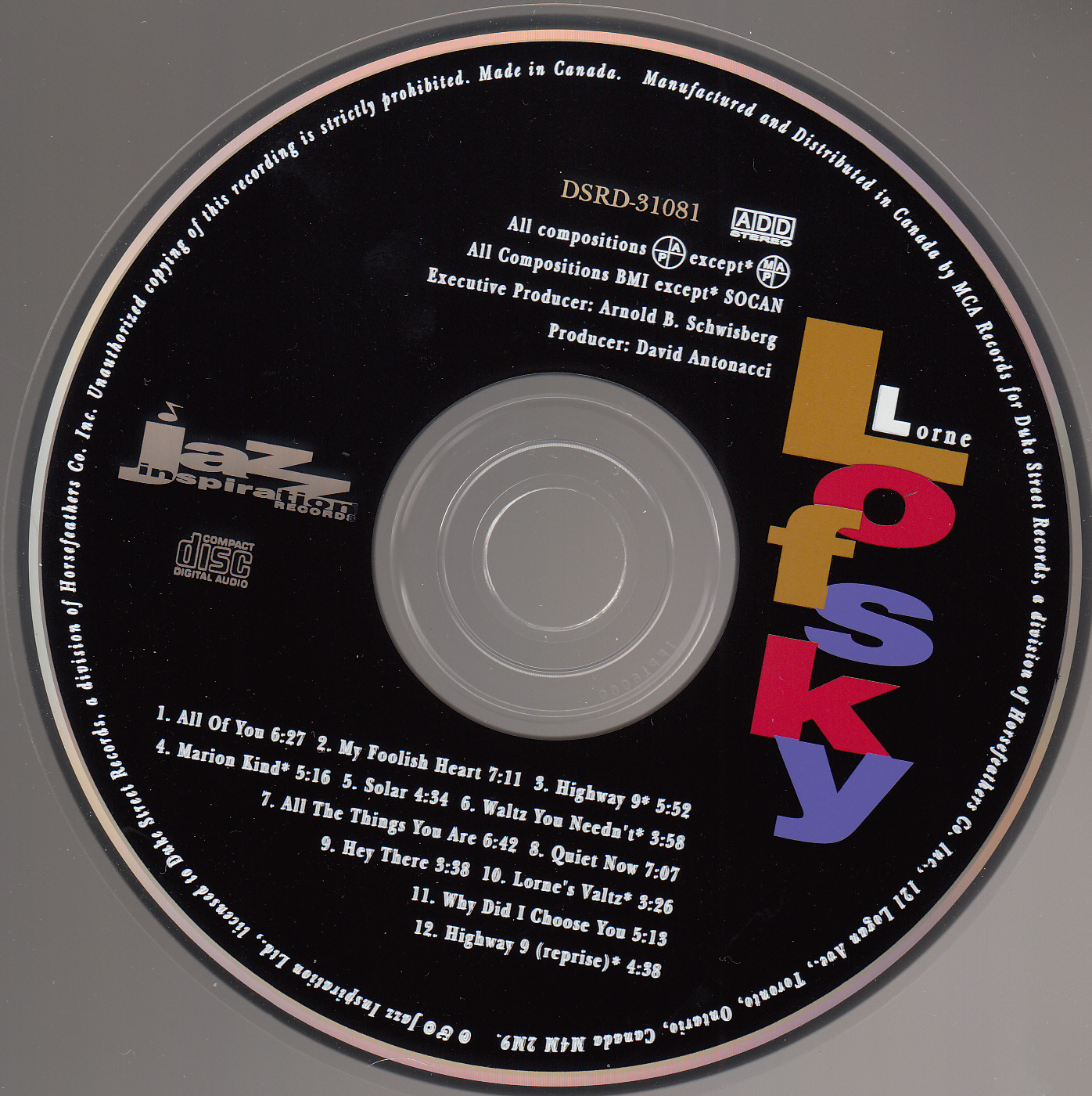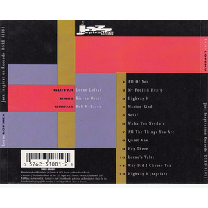 Guitarist Lorne Lofsky’s first album for the Jazz Inspiration label, and his first recording as a leader in 11 years, finds him in a much different state of development than on his prior Pablo release. Gone are the blues-influenced phrases, and the direct resemblance to fellow Canadian guitarist Ed Bickert (although Bickert’s presence is still evident in the advanced chordal playing of Lofsky’s music). What remains is a very aggressive, harmonically and rhythmically sophisticated player whose unique guitar style bears a striking resemblance to Bill Evans. The Evans influence is everywhere on this recording, from the choice of material (“All of You,” “My Foolish Heart,” “Solar,” and “Quiet Now” were all part of Evans’ repertoire), to the tracks which feature Lofsky overdubbing multiple guitars, a procedure Evans employed on several records. The trio is at its’ most furious on the title track, and on “All the Things You Are”; Lofsky constantly altering and displacing the harmonic movement of the tunes, while drummer Bob McLaren aggressively sets up false cadences and climaxes, disguising the form of the music. Solos by bassist Kieran Overs are often used by Lofsky as a means of further interaction, eschewing traditional chordal accompaniment, in favor of short phrases in response to the bassist’s lines (another trademark of Bill Evans). The rest of the album is somewhat lower key, although the music is always highly interactive and interesting. This is not a record for everyone; some may find Lofsky’s playing overbearing. For fans of the style, though, this comes highly reccommended.