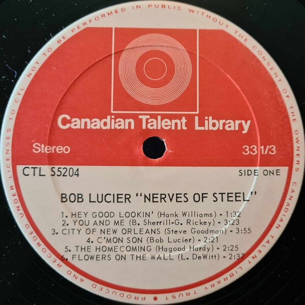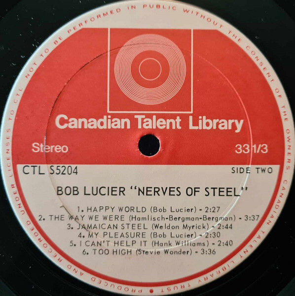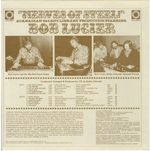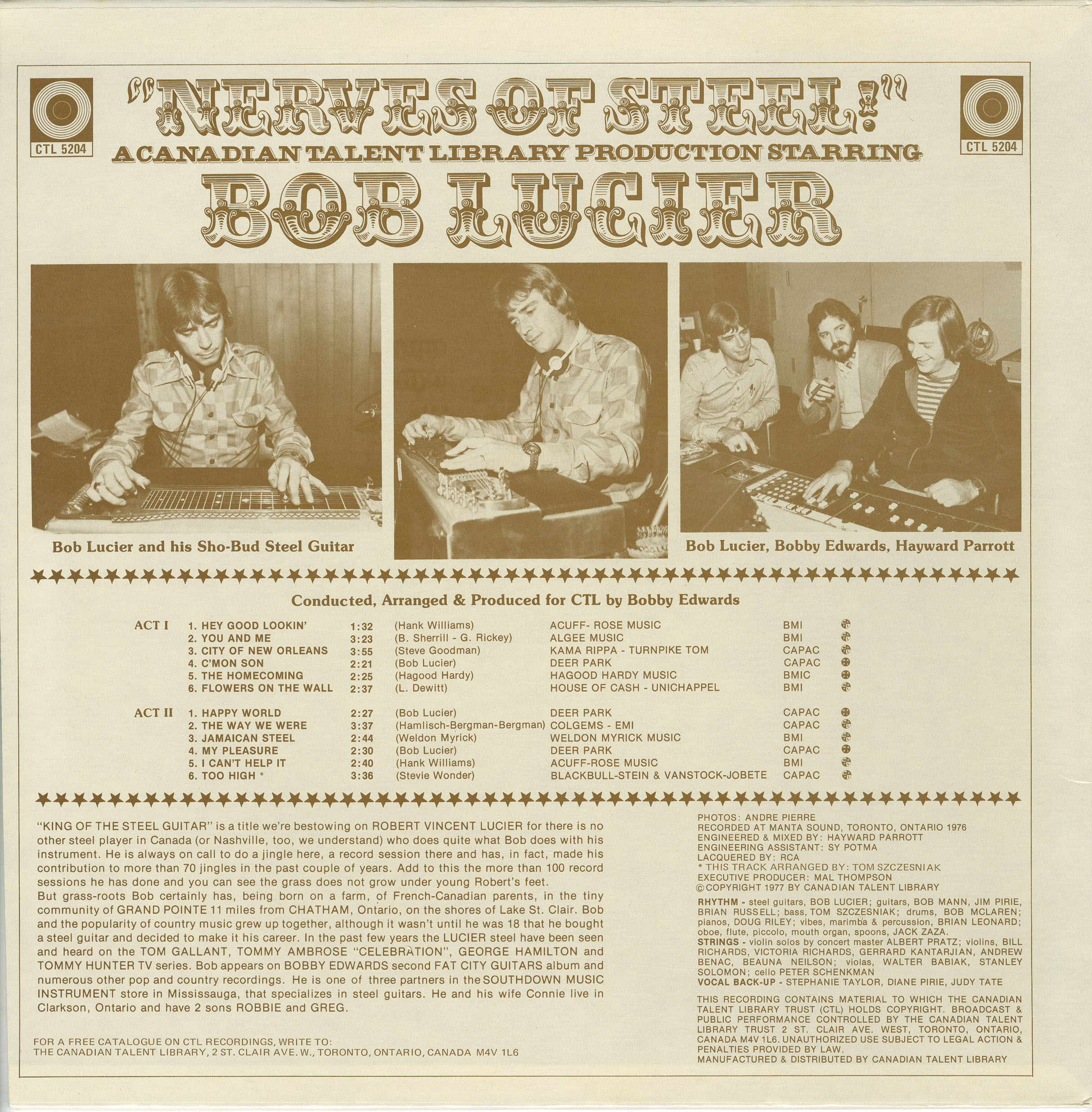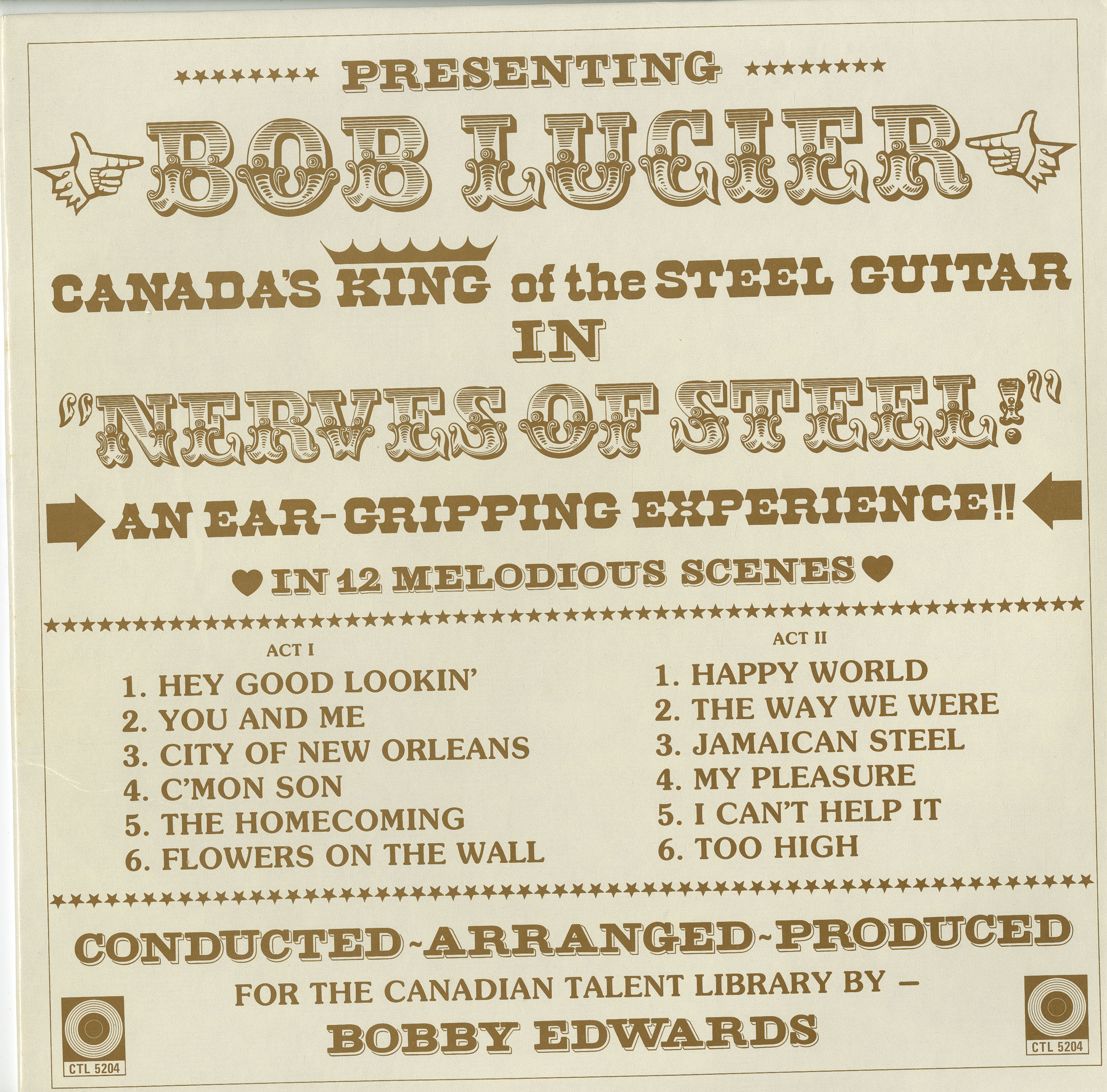 Lucier’s own recording legacy centres on Nerves of Steel, released by the Canadian Talent Library in 1977 and recorded at Manta Sound in Toronto. The album brought together major studio figures of the day — including Doug Riley, Tom Szczesniak, Jack Zaza, Stephanie Taylor, Judy Tate, and a full string section — under producer and arranger Bobby Edwards. The record remains one of the best-known steel-focused albums produced in Canada, and a clear document of Lucier’s melodic and textural approach to the instrument.