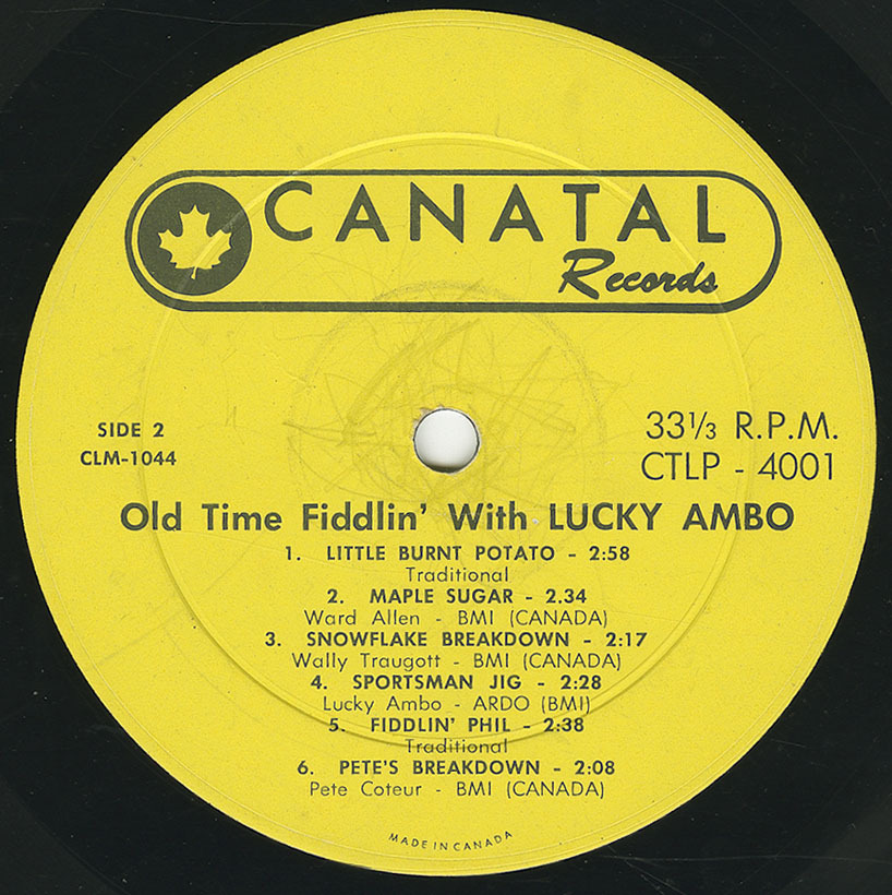 Lucky Ambo (Ambeault) is French-Canadian and his playing denotes the musical family he came from. Born in Bathurst, New Brunswick, he made music his profession. His credits read like a grand tour of the Western circuit. CBC, Dominion Barn Dance, Country Hoedown, etc., and he was winner of the 1955 Dominion Fiddle Championship. He has appeared with many of Canada’s finest old time artists. Lucky plays most string instruments and has composed many original tunes, several of which appear on this LP.
