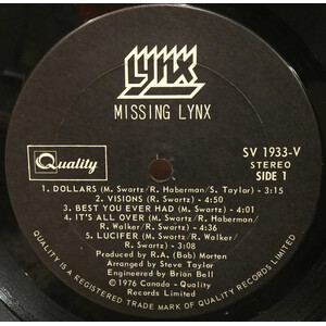 "Missing Lynx" is the debut studio album from Canadian Hard Rock band Lynx. Formed in Toronto by high school friends Mike Swartz and Bob Walker in 1973, they recruited Swartz's younger brother Rob as the second guitarist, and with Walker handling bass, they added Rick Haberman on drums. This album was on the store shelves by that summer, and tracks like the lead-off and first single "Dollars," "Best You Ever Had," "Lucifer" and anthemic "Goodbye Education, Hello Rock & Roll" captured the band's live essence, and word of the band's raucous and flambouyant show continued to spread.