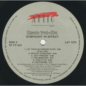 Symphony in Effect is the debut album of Canadian rapper Maestro Fresh-Wes, released in 1989 on Attic/LMR Records. In Canada, the album nearly went double platinum and remains one of the best-selling Canadian hip hop albums of all time. The first single "Let Your Backbone Slide" became the first hit single in Canadian hip hop history, appearing on Billboard's Hot Rap Singles chart. A second single, "Drop the Needle", was released in 1990.