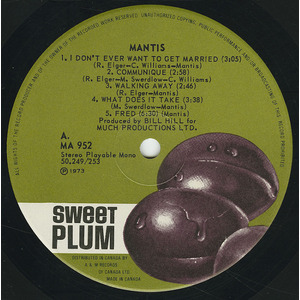 The self-titled debut album, Mantis, was released in December 1973 on Sweet Plum Records. While initial recordings wrapped up in November, the band had originally intended to include a cover of Suzi Quatro’s "Can The Can", but ultimately decided to focus on original material.