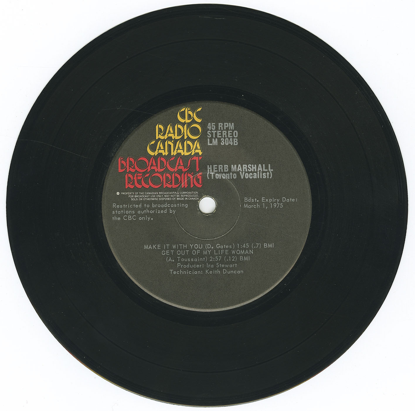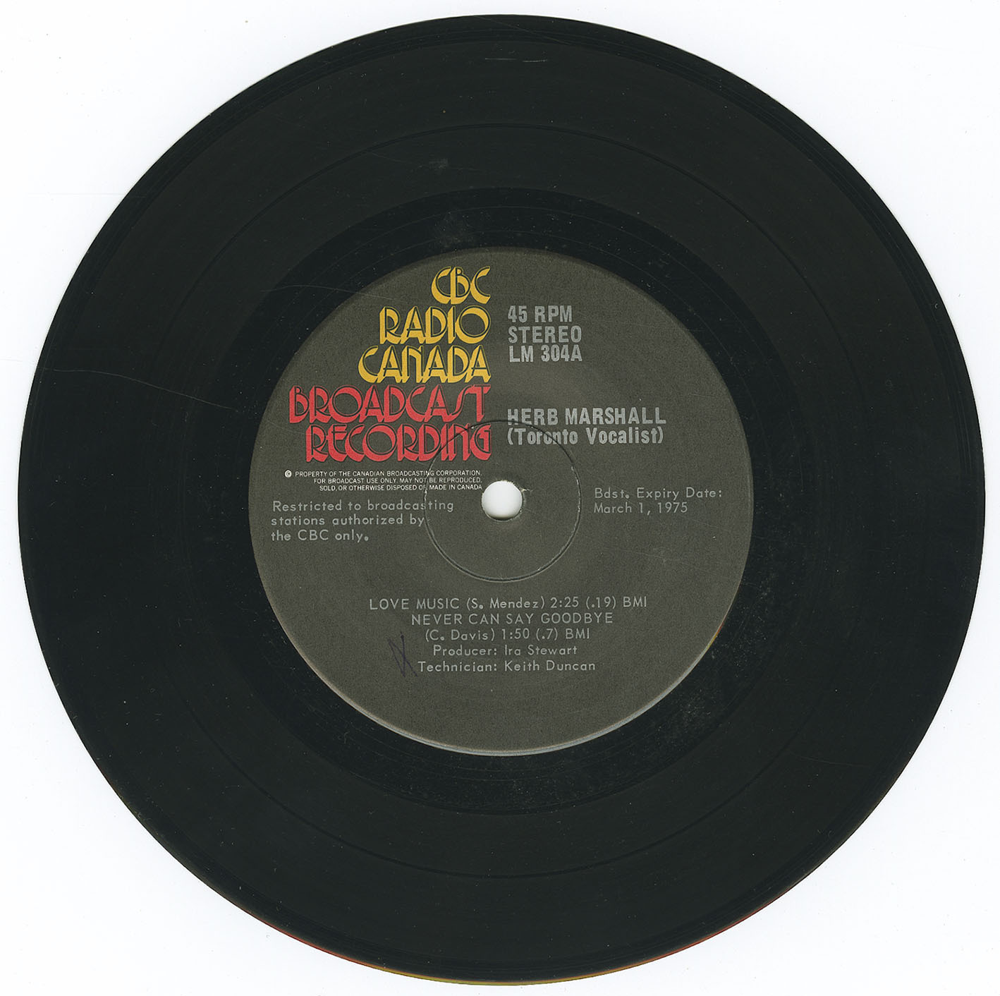 In 1975, Marshall released his only known vinyl recording, a rare 45 RPM titled Toronto Vocalist, produced by Ira Stewart and released by CBC Radio Canada. This record showcased his exceptional talent through soulful renditions of tracks like “Love Music,” “Never Can Say Goodbye,” “Make It With You,” and “Get Out of My Life Woman.” The 45rpm single is a testament to his unique ability to reinterpret contemporary songs with elegance and emotional depth, cementing his legacy as both a gifted vocalist and a versatile performer.