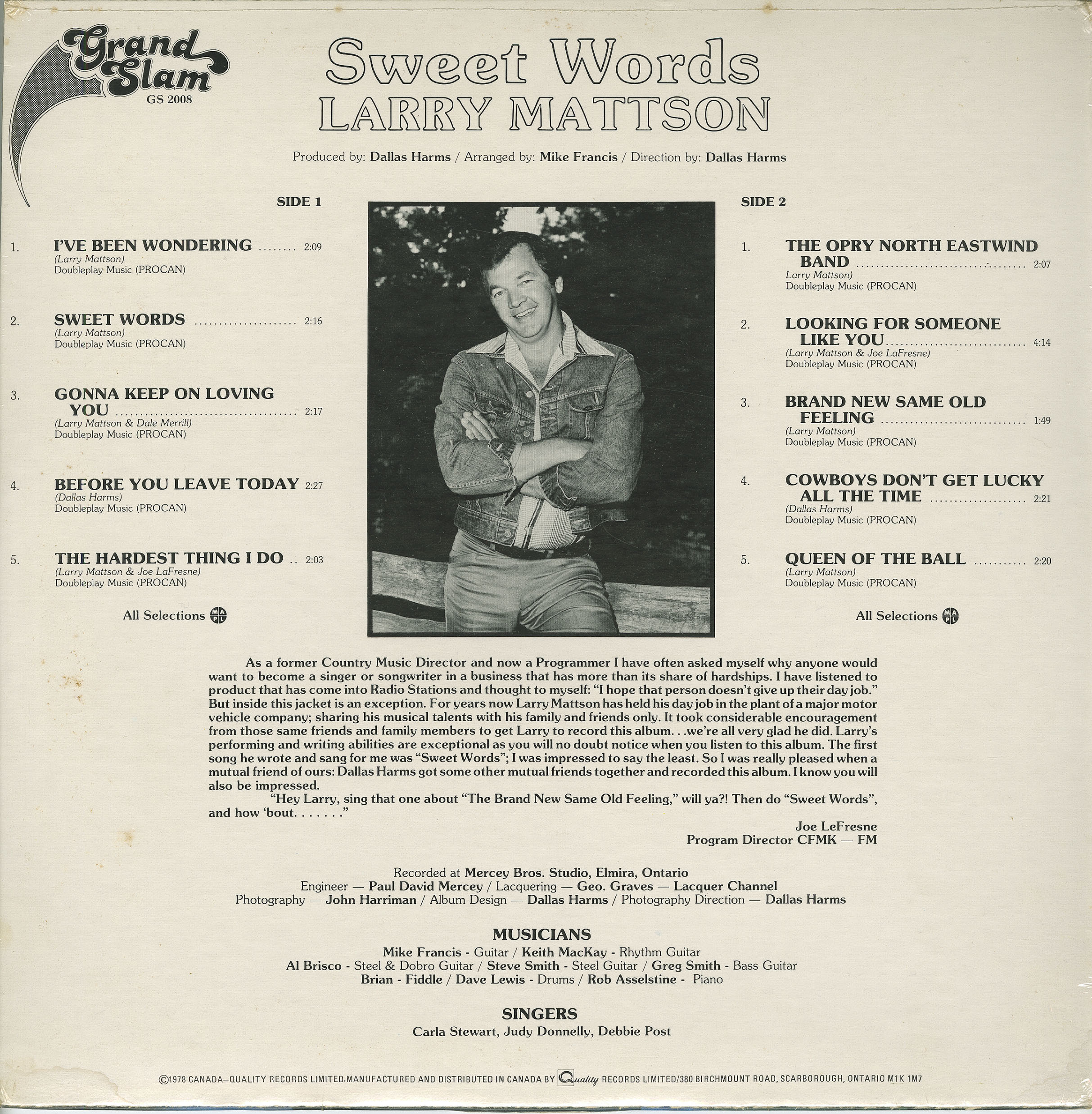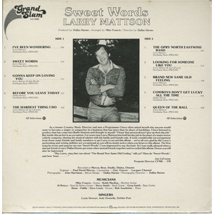 Born in New Brunswick, Larry Mattson first gained national attention with his music after he moved to Ontario, settling first in Hamilton. While performing at various local events he was 'discovered' by famed Canadian singer/songwriter Dallas Harms, who brought him into The Mercey Brothers recording studio in Elmira, Ontario and recorded the album "Sweet Words" released on Grand Slam Records (#GS-2008) in 1978. The album featured 8 of Mattson's own compositions and two Dallas Harms songs, "Before You Leave Today" and "Cowboys Don't Get Lucky All The Time", an earlier hit record for Nashville's Gene Watson.