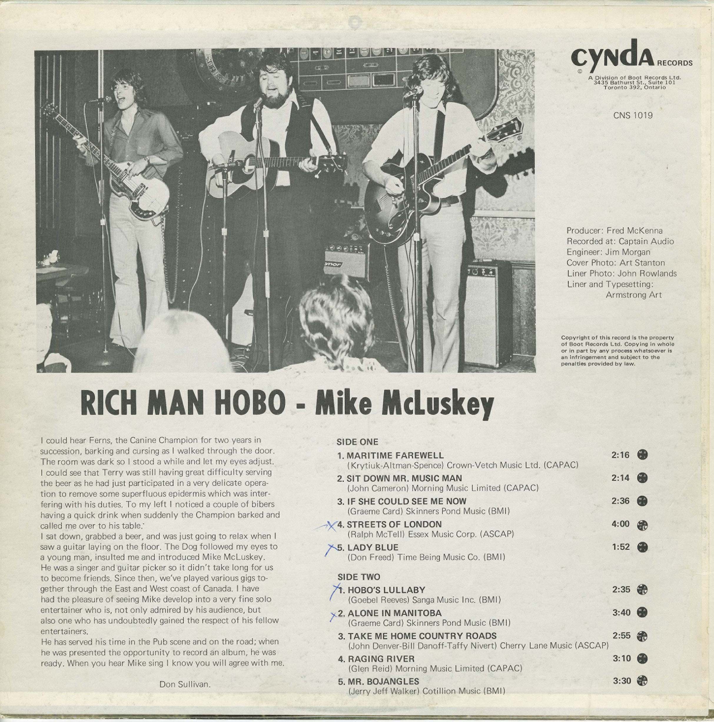 Mike McLuskey recorded his 1972 album "Rich Man Hobo" (Cynda-CNS-1019) at Toronto's Captain Audio Studios with Fred McKenna producing. The contents of the album include songs penned by Canadian songwriters, John Allan Cameron, Graeme Card, Don Freed, and Glen Reid, as well as the Jury Krytiuk/Mark Altman Canadian standard "Maritime Farewell". With that particular song, as well as the John Allan Cameron tune "Sit Down Mr. Music Man" and with Fred McKenna producing, one may deduce that Mike McCluskey hailed from the Canadian Maritimes, however nothing in the album's liner notes provides any information about the artist, Mike McLuskey.