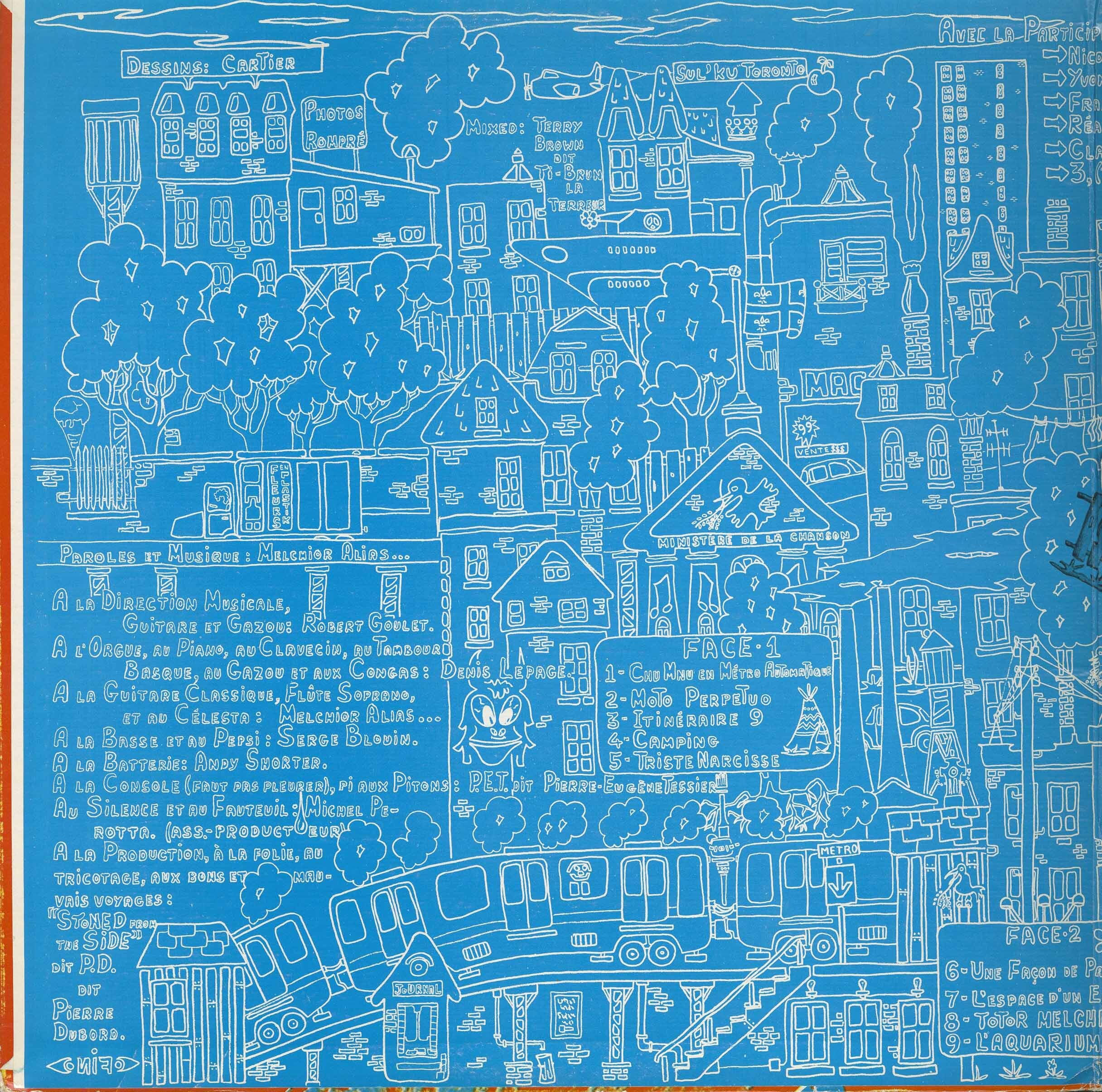 Under the musicale direction of Robert Goulet (guitare); Denis Lepage (piano, orgue, clavecin, congas); Serge Blouin (basse); Melchior Alias...(guitare, seche, celesta, flute, soprano); Peter Tessier (ingenieur du son); Terry Brown (mixage); Michel Perotta (assistant a la productio); Pierre Dubord (directeur de la production); Jacques Cartier (maquette).