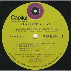 This French-Canadian ultra-rarity makes its long-overdue CD debut here. Originally issued in 1969, it's a crazed blend of catchy pop, funky grooves and spaced-out psychedelia, with plenty of acid guitar. The identity of the enigmatic Melchior Alias remains unknown, but numerous leading lights of Quebec's progressive music scene are involved, including arranger and future disco luminary Denis Lepage and engineer Peter Tessier (later to make his own rare album). It seems likely that the credit for Robert Goulet as musical director is a joke -- but anything seems possible on this most strange and mysterious of discs. "From Quebec and sung in French, this goofy fusion of guitar, organ, drums and mild electronics has an amiable air of stoned experimentalism ... the highlights are the bizarre groover 'Itineraire 9,' laid-back ballad 'L'Espace d'un Été' and spacey 'L'Aquarium,' which recall the more experimental work of Michel Polnareff and Serge Gainsbourg. Two 45s were extracted, and quite a lot of effort went into the packaging, but promotion and distribution must have been poor, as it's easily one of the rarest major label albums of the period."