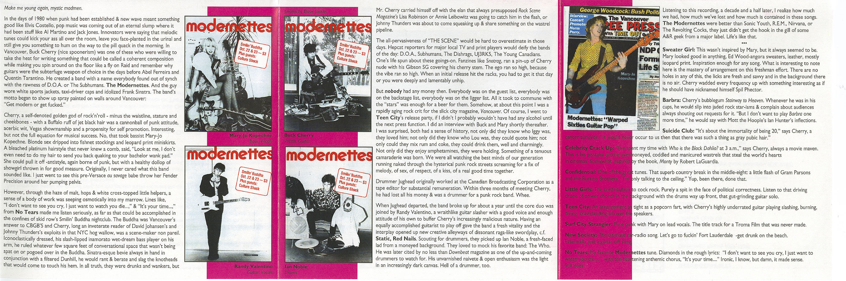 Forming in 1980, The Modernettes were a Canadian punk band from Vancouver. The band were a three piece, John "Buck Cherry" Armstrong was on guitar/vocals, Mary Jo Kopechne covered bass/vocals, and John "Jughead" McAdams played drums and sang as well. The band has been described commonly by critics as a mix between The Velvets and Ramones. The band had a sound that was a mix of pop and punk way before the days of modern pop-punk bands such as Sum 41; the band also was influenced by other bands, like The Who. The band was not like other Canadian punk acts like D.O.A. or The Subhumans, they were different.