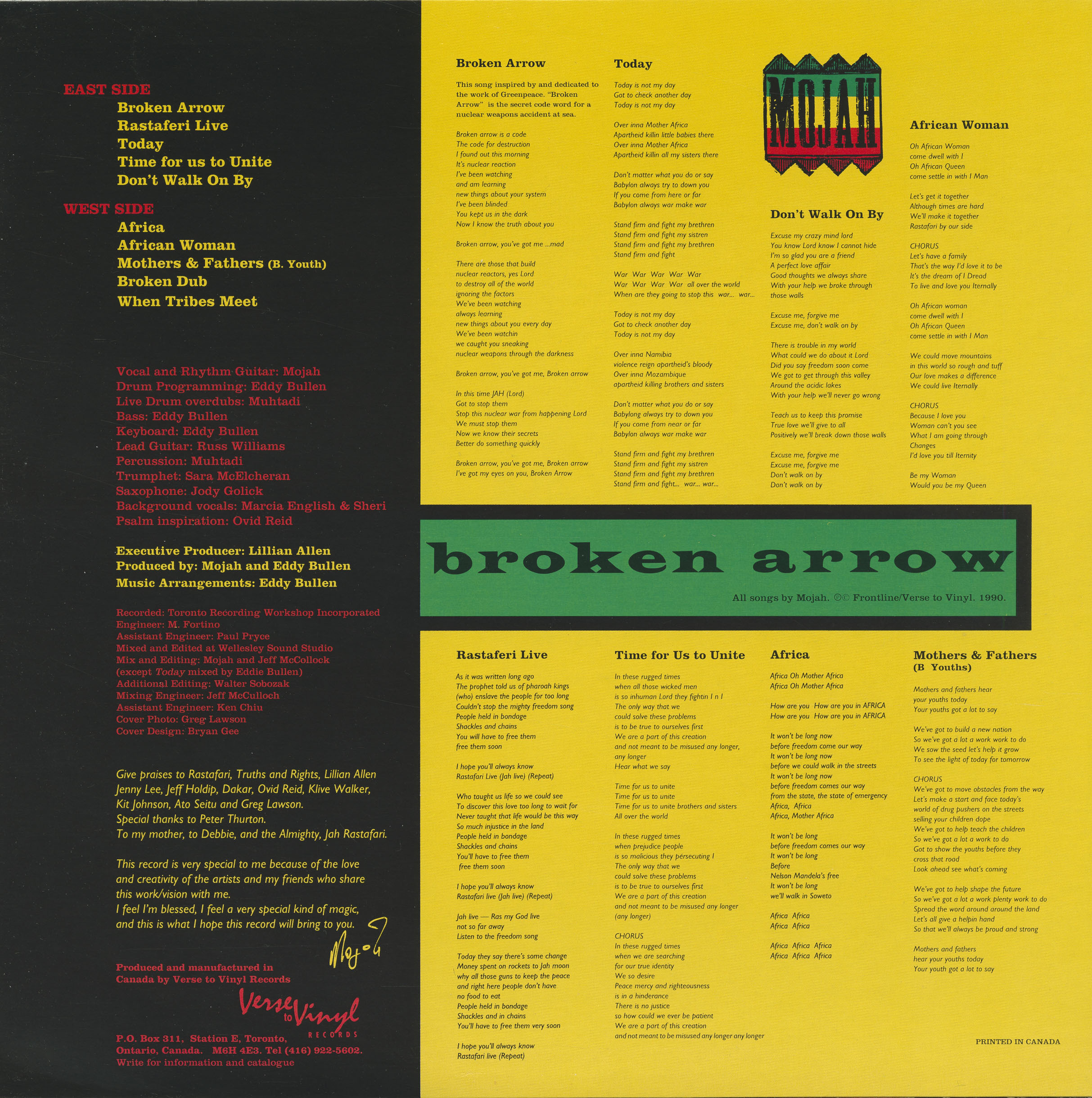 In 1990, Mojah released the solo album Broken Arrow on Toronto’s Verse to Vinyl label. Recorded at Toronto Recording Workshop and mixed by Jerry Brown at Kingsound Studio, the album was co-produced with noted Canadian jazz-fusion keyboardist Eddy Bullen, who handled drum programming, bass, keyboards, and overdubs. Featuring contributions from Muhtadi (percussion, live drum overdubs), Sara McClurehan (trumpet), and Jody Golick (saxophone), Broken Arrow presents a distinctive electronic reggae fusion sound, with digital rhythms layered beneath live instrumentation and atmospheric arrangements.