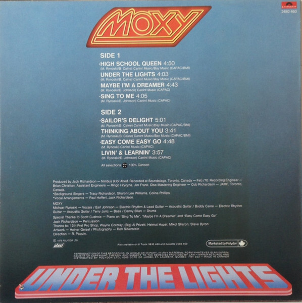 With the departure of Buzz Shearman from Moxy in 1977 for medical reasons, Mike Rynosky (Reno) was brought in as lead vocalist. In 1978, the first album with Reno, entitled Under the Lights, was released. This album saw a more laid-back style in the sound of Moxy with a strong concentration on a blues styling rather than hard rock. The vocal work of Reno was not as strong or dynamic as Shearman's and the entire album lacked the punch of the band's earlier works. Under the Lights was the last album of original material released by the band with exception of a hits compilation in the '80s . In 1983, Buzz Shearman died as a result of a motorcycle accident and a tribute album featuring some of his best songs with Moxy was released in the late '90s. This release of Under the Lights by Unidisc is a straight reissue of the original Mercury/ Polydor Records album at a budget price complete with original artwork but, unfortunately, it contains no bonus tracks. In 2000, Moxy re-formed with new vocalist Brian Maxim and released the album Moxy V for Pacemaker Records.