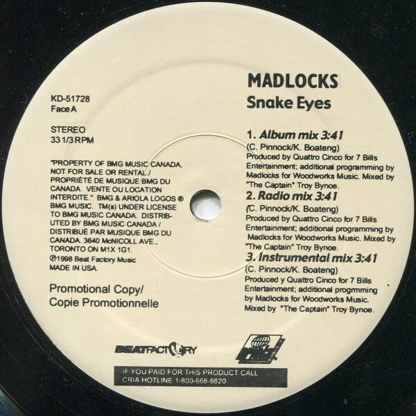 Side A contains album, radio, and instrumental mixes of “Snake Eyes.”