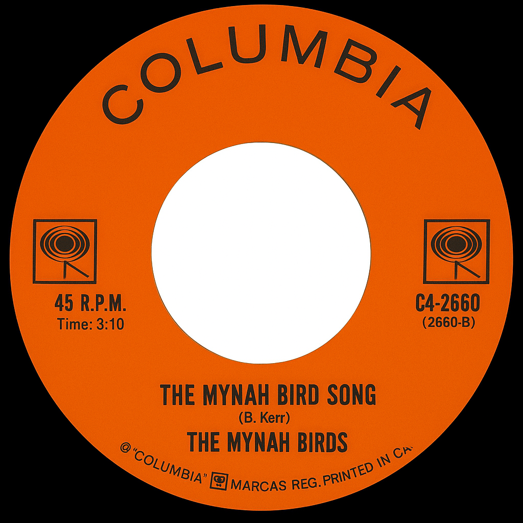 Under Kerr’s guidance, the group recorded their first Canadian single in early 1965 for Columbia Records: “The Mynah Bird Hop” backed with “The Mynah Bird Song” (C4-2660). Written by Kerr’s brother Ben Kerr, the record featured Jimmy Livingston (vocals), Frank Arnel (guitar), and Goldy McJohn (organ), and included contributions from several players who floated in and out of the lineup. Though a commercial failure, it marked Rick James’s first official studio release.