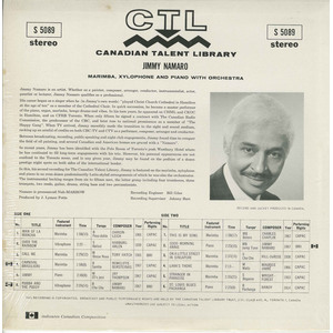 In this, his second recording for The Canadian Talent Library, Jimmy is featured on the marimba, xylophone and piano in an even dozen predominantly Latin-styled arrangements of which he was also the orchestrator. The instrumental backing ranges from six to fifteen men, the latter group including four trombones, three trumpets, two reeds, guitar, drums, string bass and two percussionists.