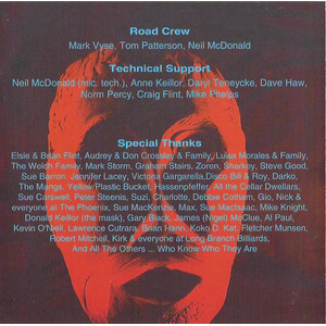 Elsie & Brian Flint, Audrey & Don Crossley & Family, Luisa Morales & Family, The Welch Family, Mark Storm, Graham Stairs, Zoren, Sharkey, Steve Good, Sue Barron, Jennifer Lacey, Victoria Gargarella, Disco Bill & Roy, Darko, The Mangs, Yellow Plastic Bucket, Hassenpfeffer, All the Cellar Dwellars, Sue Carswell, Peter Steenis, Suzi, Charlotte, Debbie Cotham, Gio, Nick & everyone at The Phoenix, Sue MacKenzie, Max, Sue MacIsaac, Mike Knight, Donald Keillor (the mask), Gary Black, James (Nigel) McClue, Al Paul, Kevin O’Neill, Lawrence Cutrara, Brian Hann, Koko D. Kat, Fletcher Munsen, Robert Mitchell, Kirk & everyone at Long Branch Billiards,