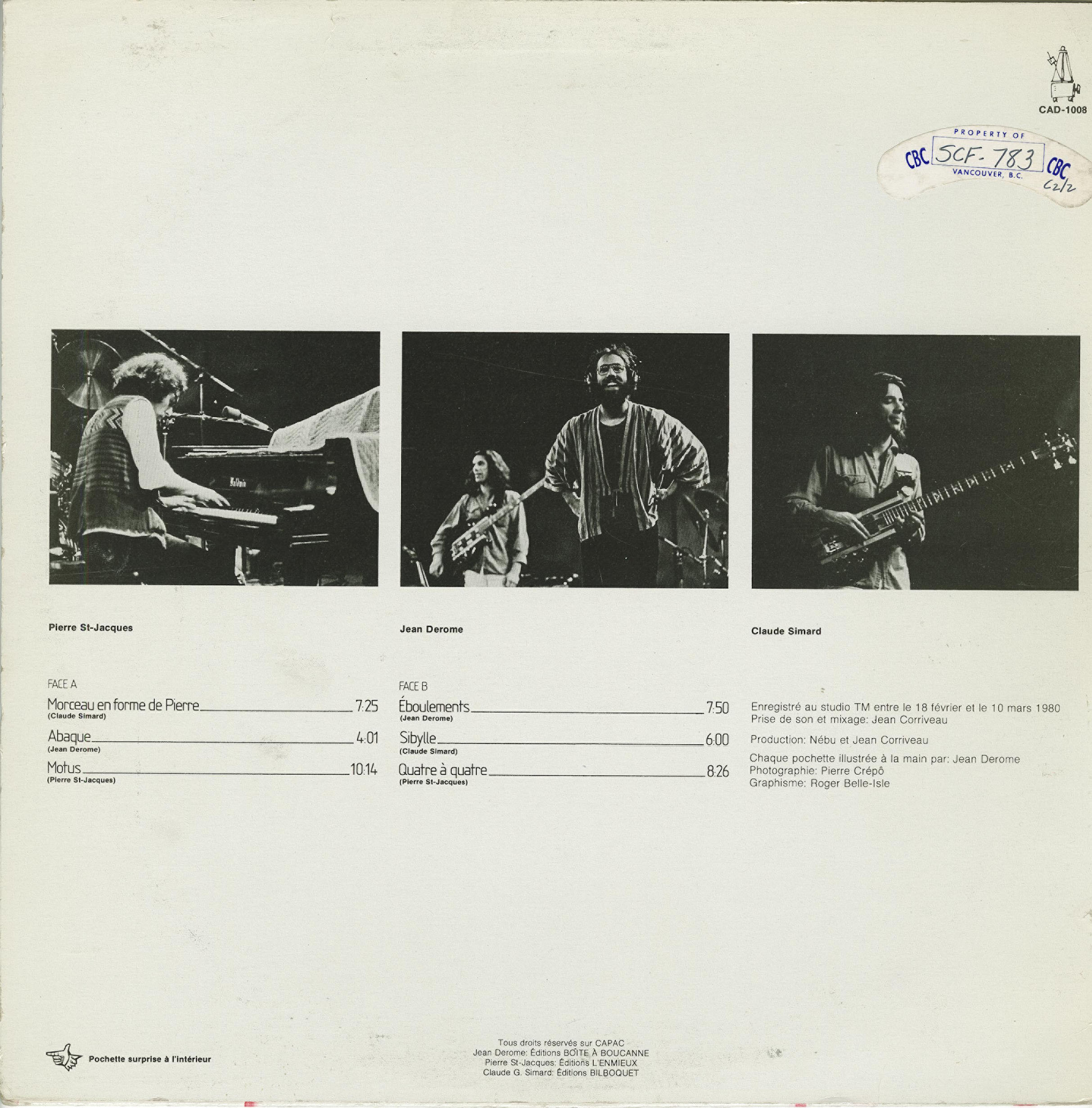 Recorded at Studio TM, Montréal, 18 February to 10 March 1980