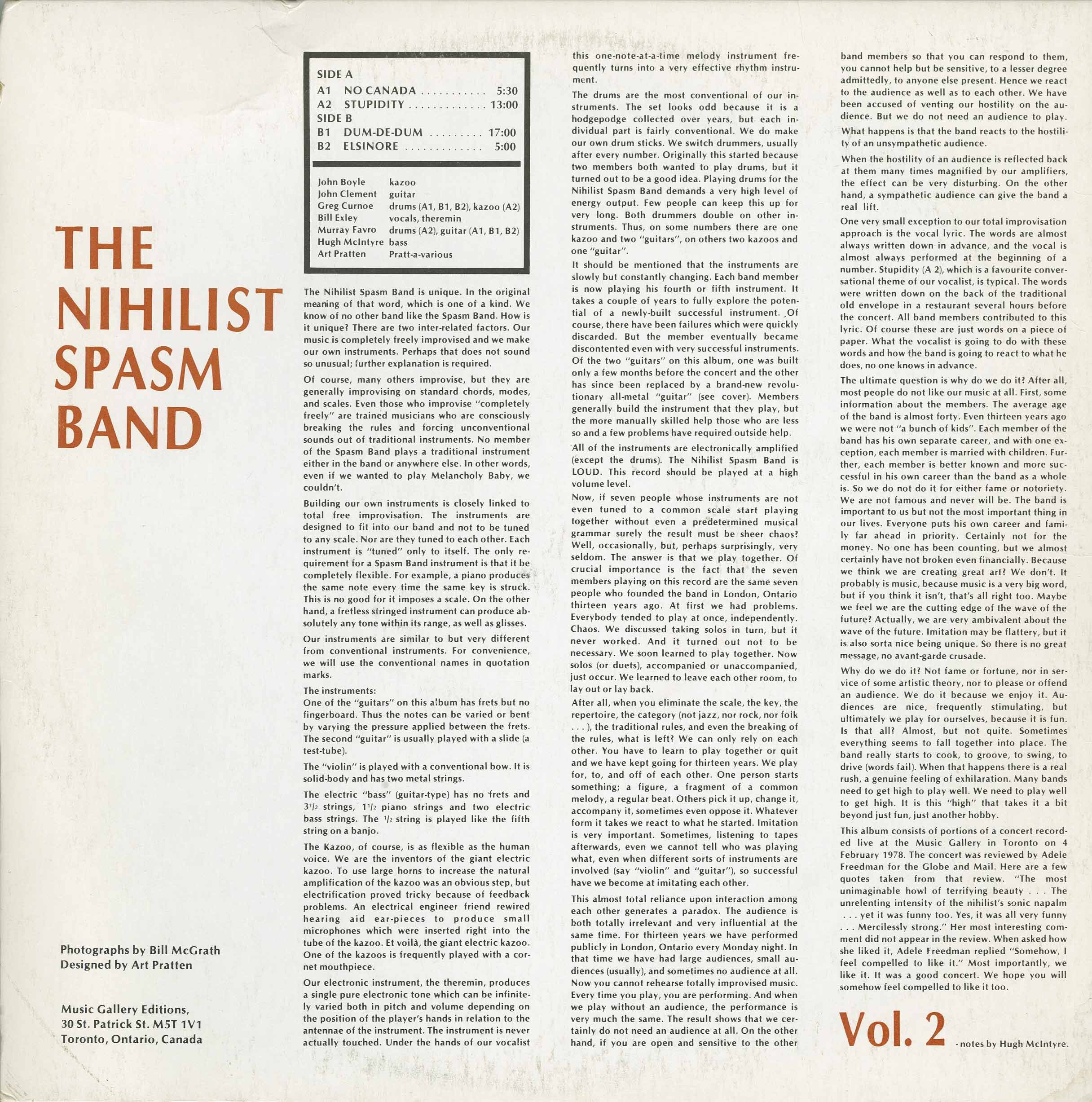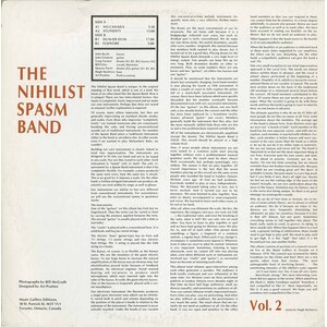 The Nihilist Spasm Band were formed in London, Ontario in 1965. Vol. 2 was their second of four vinyl releases and a total of 13 albums through 2007 and features this second version of No Canada. All of their music is free, improvised music using home-made or modified instruments such as the Pratt-a-various (Art Pratten) and Theremin (Bill Exley). Other modified instruments played included the kazoo by John Boyle; guitar by John Clement; drums and kazoo by Greg Curnoe; vocals and theremin by Bill Exley; drums and guitar was by Murray Favro; bass was by Hugh McIntyre. This album was recorded live at the Toronto Music Gallery on February 4th 1978 and released on Music Gallery Editions MGE 13 in 1979. The concert was reviewed by Adele Friedman for the Globe and Mail. Here are a few quotes taken from that review: "The most unimaginable howl of terrifying beauty...The unrelenting intensity of the nihilistic's sonic napalm....yet it was funny too. Yes, it was all very funny....Mercilessly strong". The band has recently released a best of compilation. Buy their music and read about them here: http://www3.sympatico.ca/pratten/NSB/