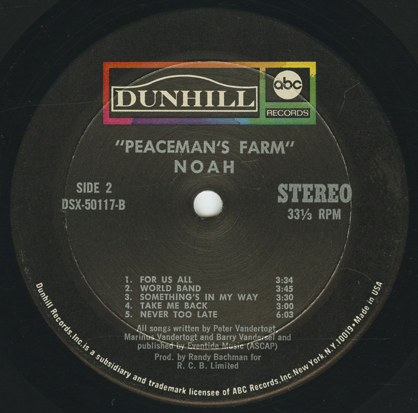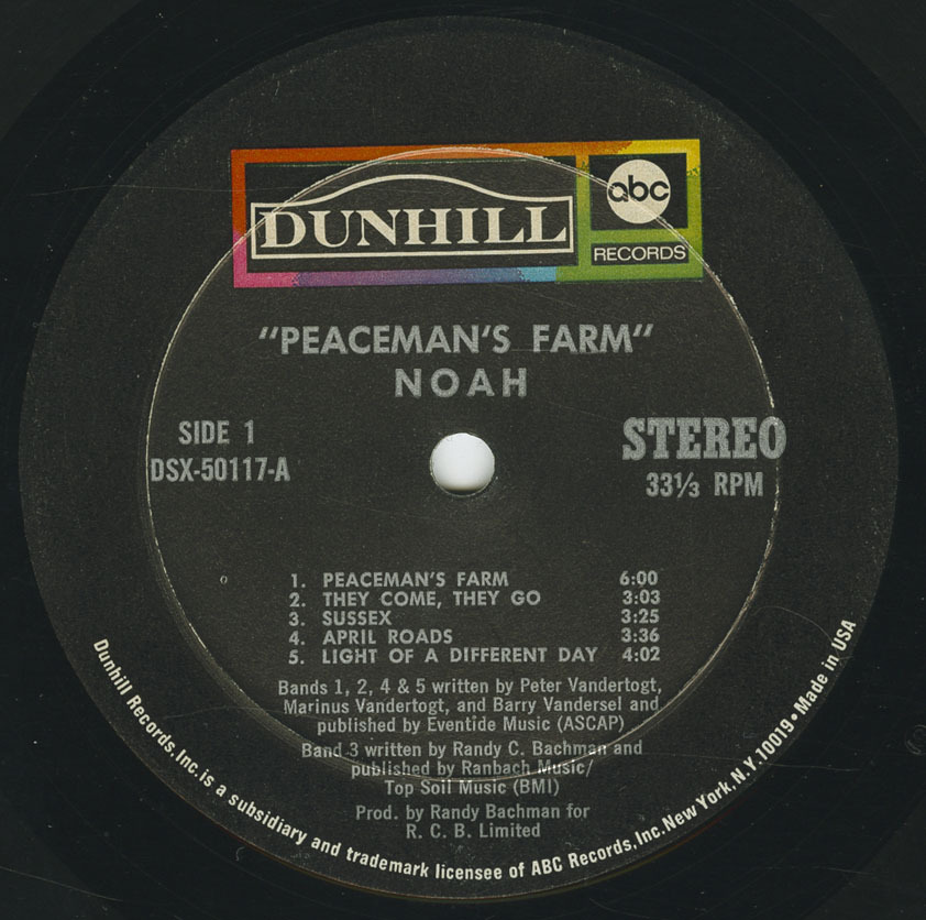 A move to ABC/Dunhill marked the most significant phase of the band’s career. Their second album, Peaceman’s Farm (1972), was produced by Randy Bachman, who also contributed guitar performances and wrote the standout track ‘Sussex’. Keyboardist Jim Morgan added prominent organ work, expanding the band’s progressive reach. Songs such as ‘World Band’ showcased Noah’s ambition and would later be covered by the American group Griffin.