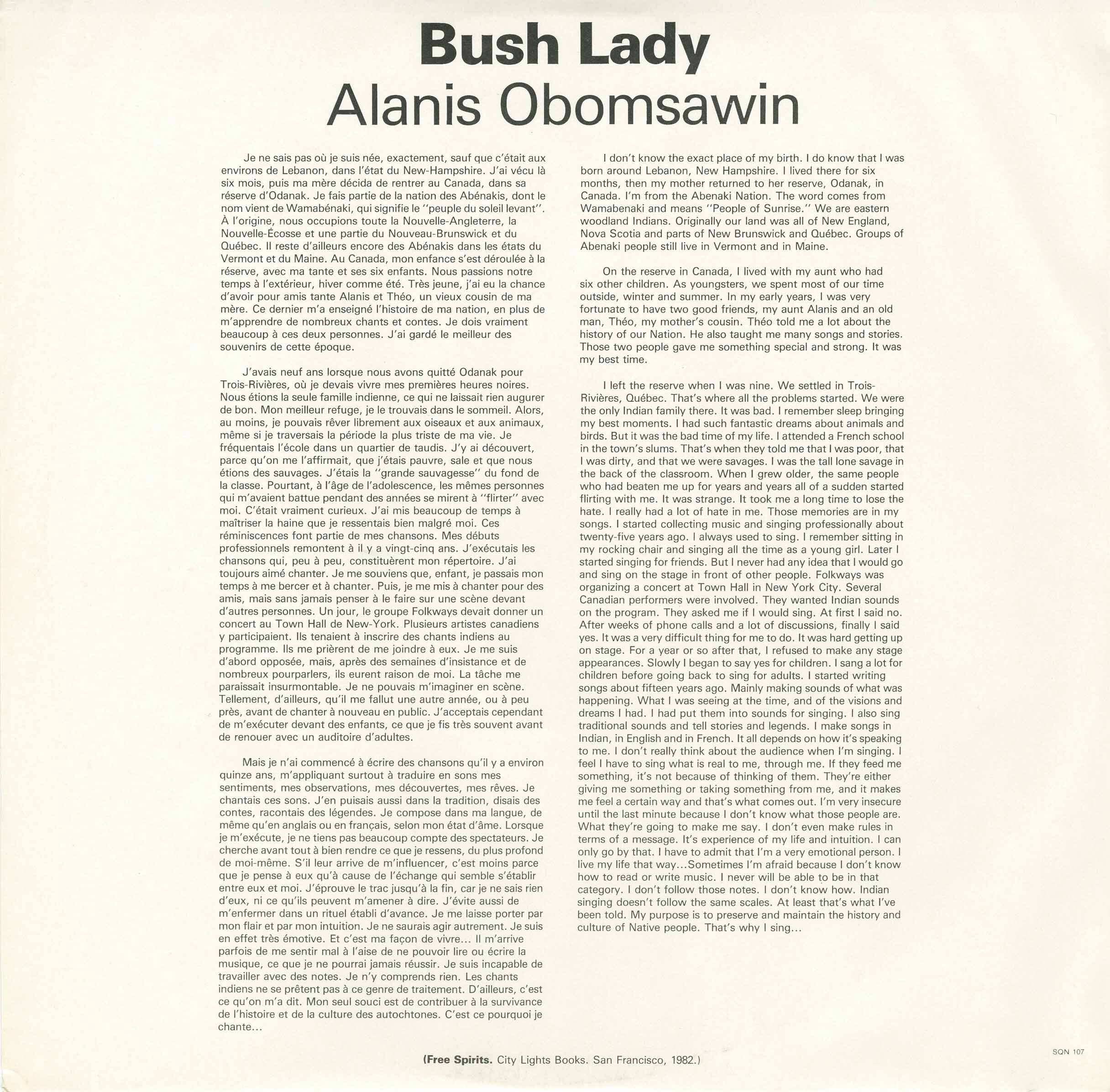 Bush Lady is the only LP ever made by Alanis Obomsawin, a member of the Abenaki First Nations and best known as one of Canada’s most accomplished and decorated documentary filmmakers. Less well known is that Obomsawin began her artistic career as a singer-songwriter in the 1960s, part of a broad movement of Indigenous artists from across North America rallying in new assertions of cultural consciousness, political rights, and reckonings with oppressive colonial history. She was invited by Folkways to perform at Town Hall in New York City in the early 1960s and spent that decade primarily identifying as a singer, channeling traditional songs hand-in-hand with modern composition. Twenty years later, amidst her burgeoning film career, Bush Lady was born of sessions sponsored by CBC Radio in 1984. Unsatisfied with these recordings, Obomsawin reclaimed the master tapes, remade the album, and issued it on her own private press in 1988. This unique, profound, magical record has been out of print and gaining cult status ever since.