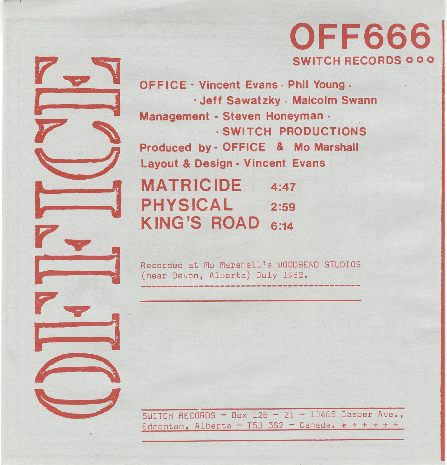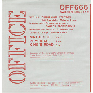 OFFICE was an art-rock, prog/punk outfit from Edmonton, Alberta, Canada circa 1980-83. Band members included Vincent Evans, Phil Young, Malcolm Swann and Jeff Sawatzky. Were quite popular in the music scene in Edmonton and Calgary playing many reknown gigs and even opening for Duran Duran in their heyday. The song 'Physical' (a tongue-in-cheek remake of Olivia Newton John's hit) actually made it onto the charts on Canadian college radio. Known for their bizarre stage shows and excellent musicianship OFFICE unfortunately disbanded in 1983 when Swann and Sawatzky left to form another popular Edmonton group called 'VOICE' with Dwayne Goettel of Skinny Puppy fame.