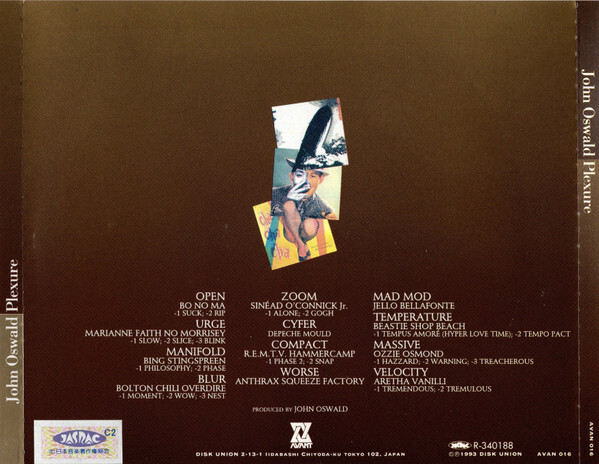 Plexure. The most in-demand Avant CD [...]. Oswald's most dense and crushingly heavy assemblage. Spectacular confusion via his most extreme stunning Plunderphonic. "His most rigorous and complex work to date, slices, chops, and blends literally hundreds of thousands of sound bites from musics known and unknown into a dizzying sonic whirlwind. You have never heard anything quite like Plexure, and you are likely never to forget it. (forced exposure)
