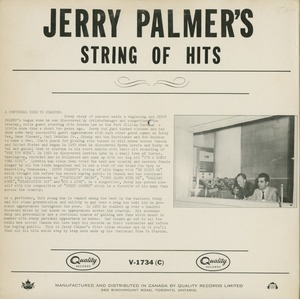 Now with this album, JERRY PALMER proudly comes out with a string of his best recordings in one package and hopes that his many Fans will shout in thunderous applause of approval from the East to the West Coast and in the far North of this big Dominion of ours. The cover photo shows Jerry at work before the microphone on one of the many master tape sessions that have resulted in this album. This is the Jerry Palmer's first Album release and in it you'll find all his hits which step by step have made up his Continual Rise To Stardom.