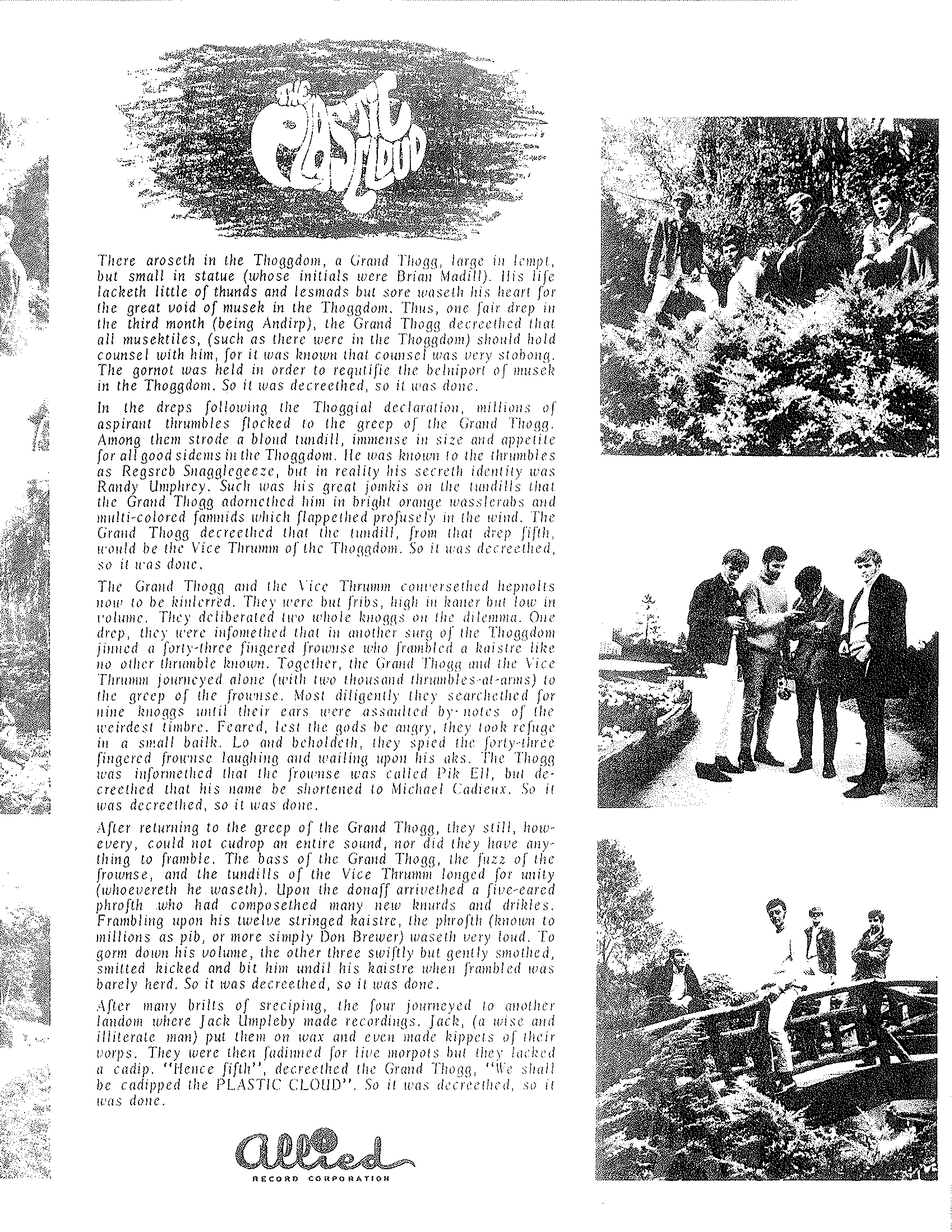 Plastic Cloud were Mike Cadieux on guitar; Don Brewer on guitar, vocals; Brian Madill on bass; Randy Umphrey on drums - together they were the pride of Bay Ridge, Ontario and together they released this magnum opus Canadian holy grail psych garage fuzz album in 1968 on Allied 10.
