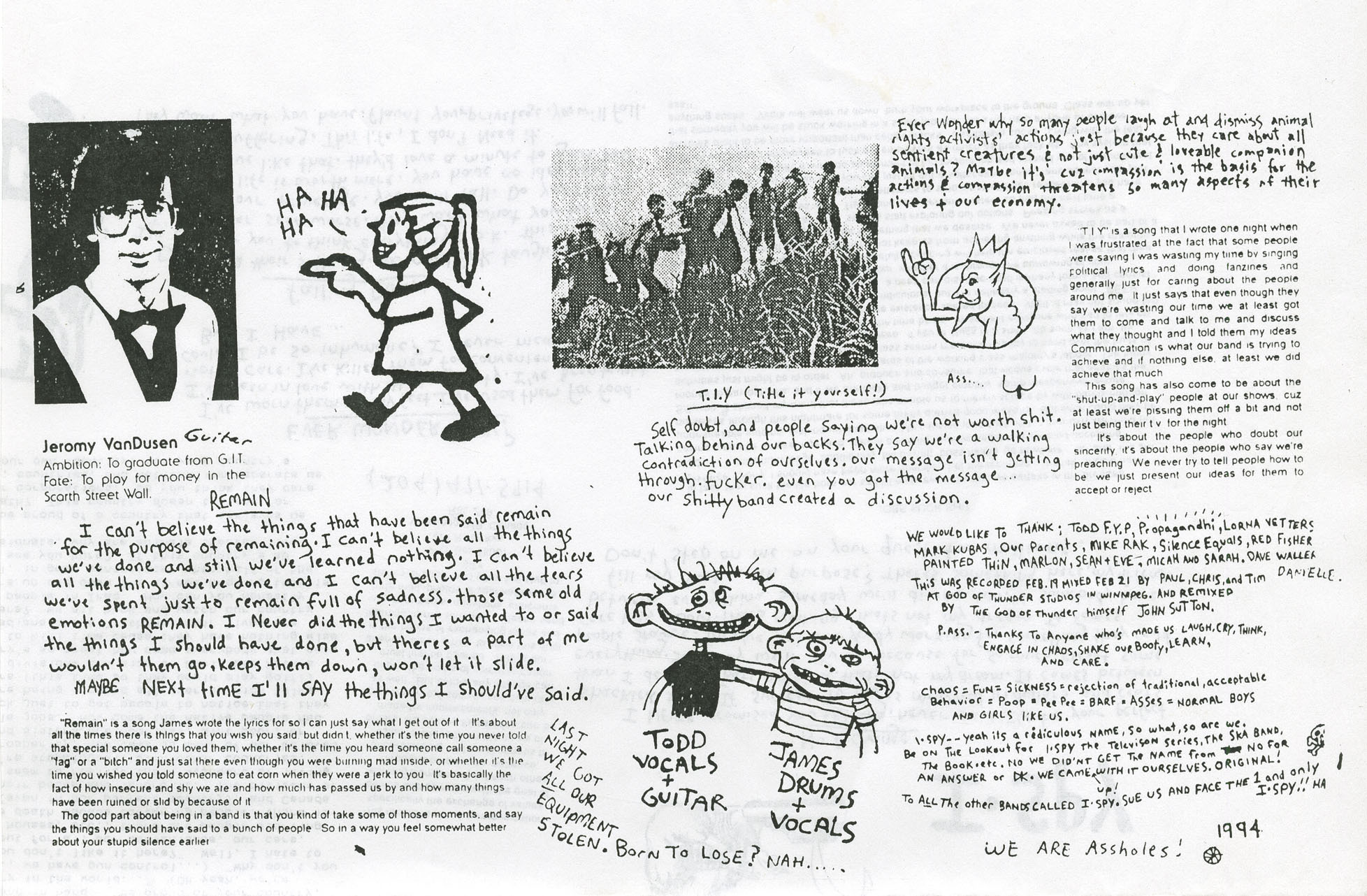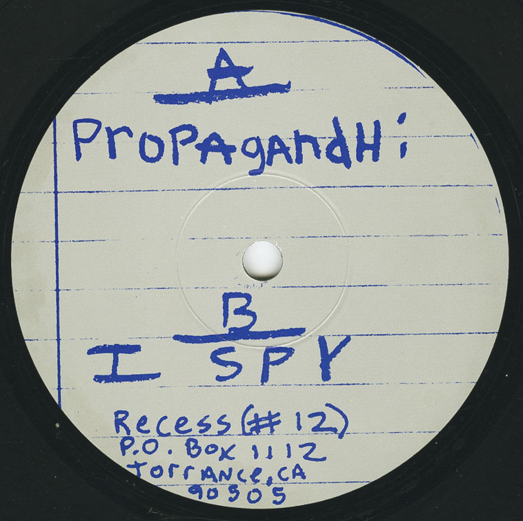 I Spy’s half of the split erupts like a Molotov cocktail — messy, emotional, and unmistakably urgent. Where Propagandhi’s songs are tightly structured and sardonic, I Spy offers pure chaotic energy laced with vulnerability. Tracks like “Remain,” “Just Between Friends,” and “Sixty Billion Served” tackle everything from toxic masculinity and emotional repression to class war and fast food imperialism. The lyrics — often scrawled like zine poetry in the album insert — hit hard with no filter, but also show a level of introspection rare in hardcore punk.