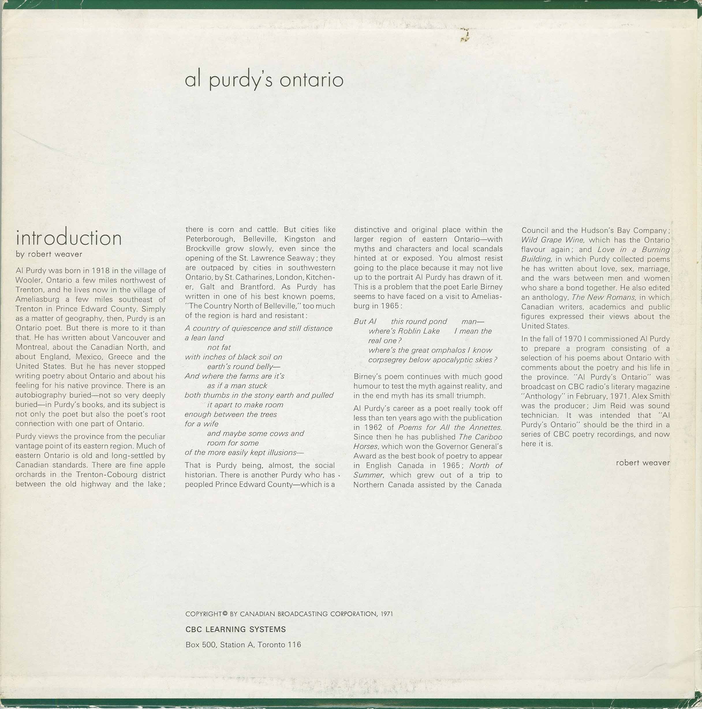 Alfred Wellington Purdy, was a 20th-century Canadian free verse poet. Purdy's writing career spanned fifty-six years. His works include thirty-nine books of poetry; a novel; two volumes of memoirs and four books of correspondence, in addition to his posthumous works. He has been called the nation's "unofficial poet laureate" and "a national poet in a way that you only find occasionally in the life of a culture."BiographyBorn in Wooler, Ontario, Purdy went to Albert College in Belleville, Ontario, and Trenton Collegiate Institute in Trenton, Ontario. He dropped out of school at 17 and rode the rails west to Vancouver.He served in the Royal Canadian Air Force during World War II. Following the war, he worked in various jobs until the 1960s, when he was finally able to support himself as a writer, editor and poet.In 1957, Purdy and his wife Eurithe moved to Roblin Lake in Ameliasburgh, Ontario (south of Trenton in Prince Edward County), where they built an A-frame cottage, and this became his preferred location for writing. In his later years, he divided his time between North Saanich, British Columbia, and his cottage at Roblin Lake.