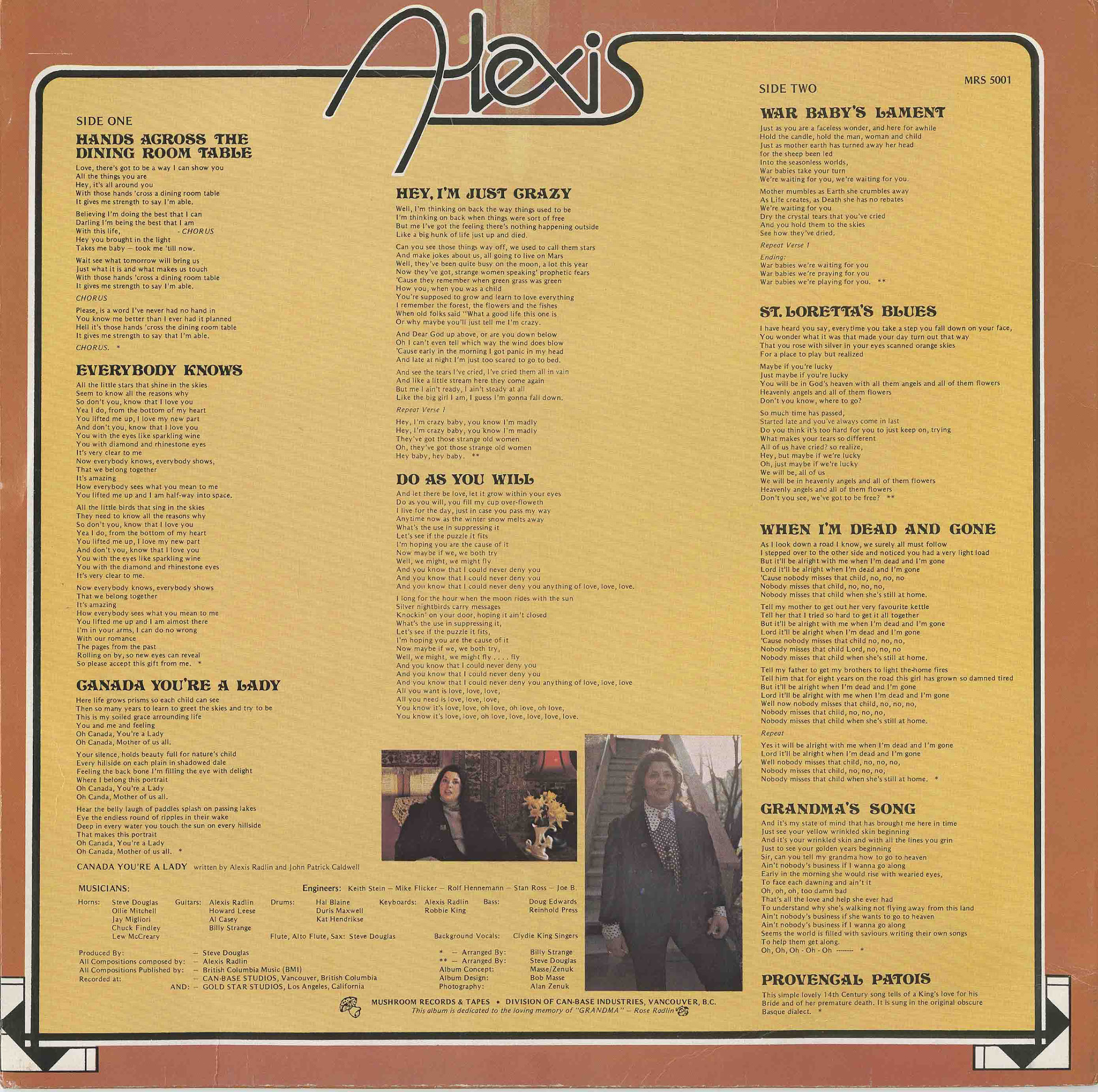 Though Alexis Radlin never achieved the mainstream fame of some of her peers, her career intersected with many of Canada’s greats, and her recordings remain a testament to an artist with a big heart, a commanding voice, and an unyielding belief in music as a force for connection. She passed away in 2001, but her work continues to resonate with collectors and listeners drawn to Canada’s rich, often overlooked musical heritage.