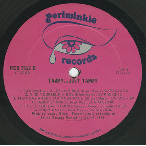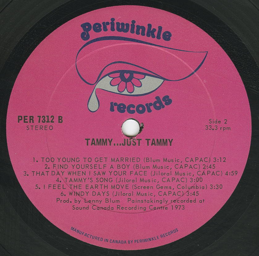 RPM quickly took notice. Her debut single “Find Yourself a Boy” drew early regional momentum, receiving playlist support across Ontario, with strong spins at CKOC Hamilton and CKWS Kingston and chart action at CHEX Peterborough. RPM highlighted her promotional push, including a well-received interview with Betty Kennedy of CFRB and a half-hour television special taped for CHEX-TV in Peterborough on August 6, 1973. CKOC’s influential music director Nevin Grant championed the record, helping drive broad Ontario exposure; Periwinkle even issued promo kits and T-shirts to support the campaign. …Just Tammy entered the RPM 100 Albums chart on July 21, 1973, rising steadily to #37 on September 29. The LP remained on the chart through the fall and reappeared in recurrent listings throughout 1974, an impressive run for a young independent artist.