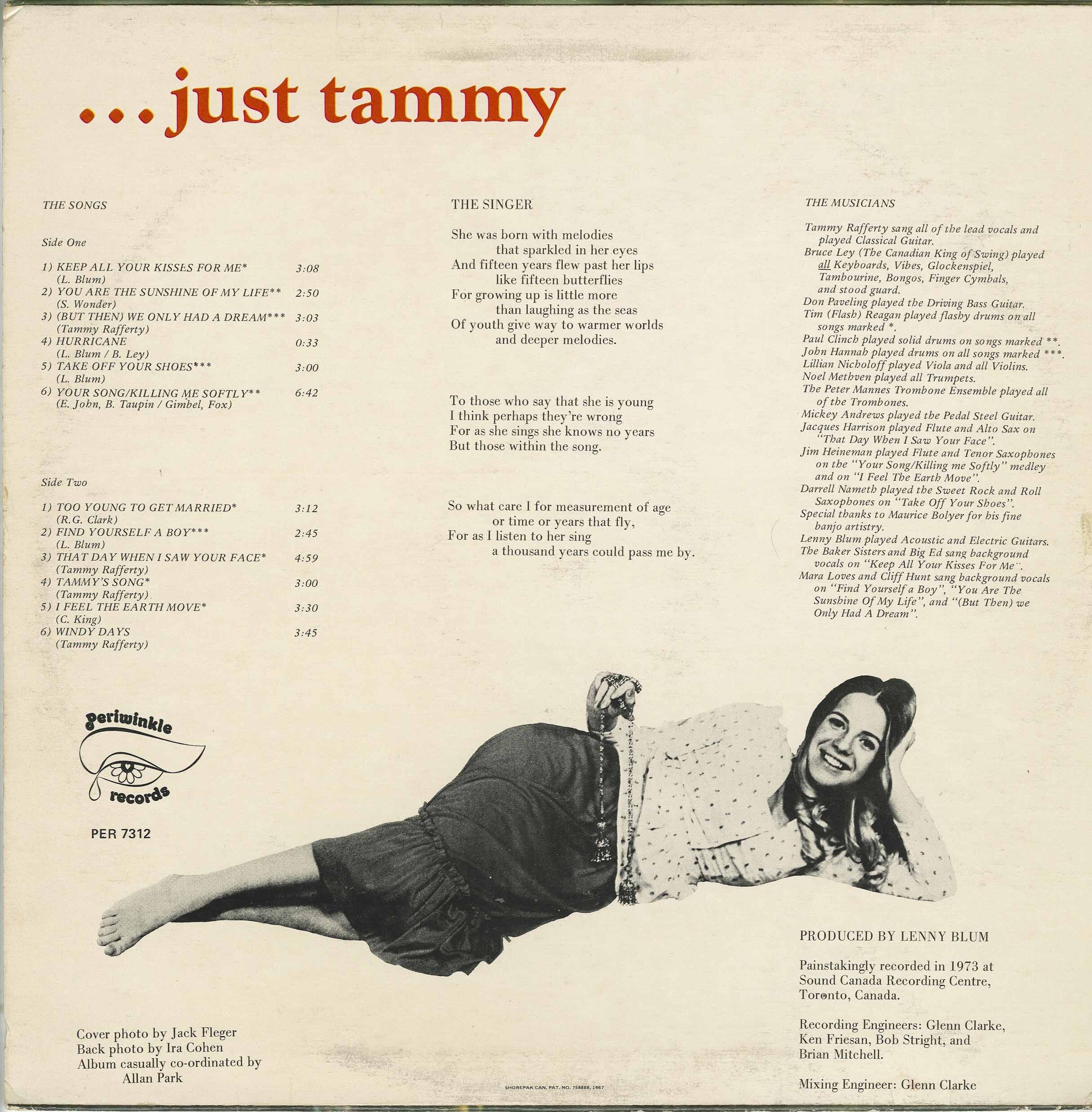 Her debut album, …Just Tammy (Periwinkle PER-7312, 1973), showcased a wide stylistic range that moved easily between contemporary pop, soulful ballads, and gentle folk-pop phrasing. Recorded at Sound Canada Recording Centre and produced by Lenny Blum, the album featured a seasoned studio ensemble including Bruce Ley, Maurice Bolyer, Mickey Andrews, and members of Toronto’s working jazz and studio circles. Rafferty handled lead vocals and classical guitar, interpreting then-current repertoire such as “I Feel the Earth Move,” “Your Song/Killing Me Softly,” and “You Are the Sunshine of My Life” alongside original and lesser-known material, delivered with a clear, earnest lyric sense and youthful intensity.