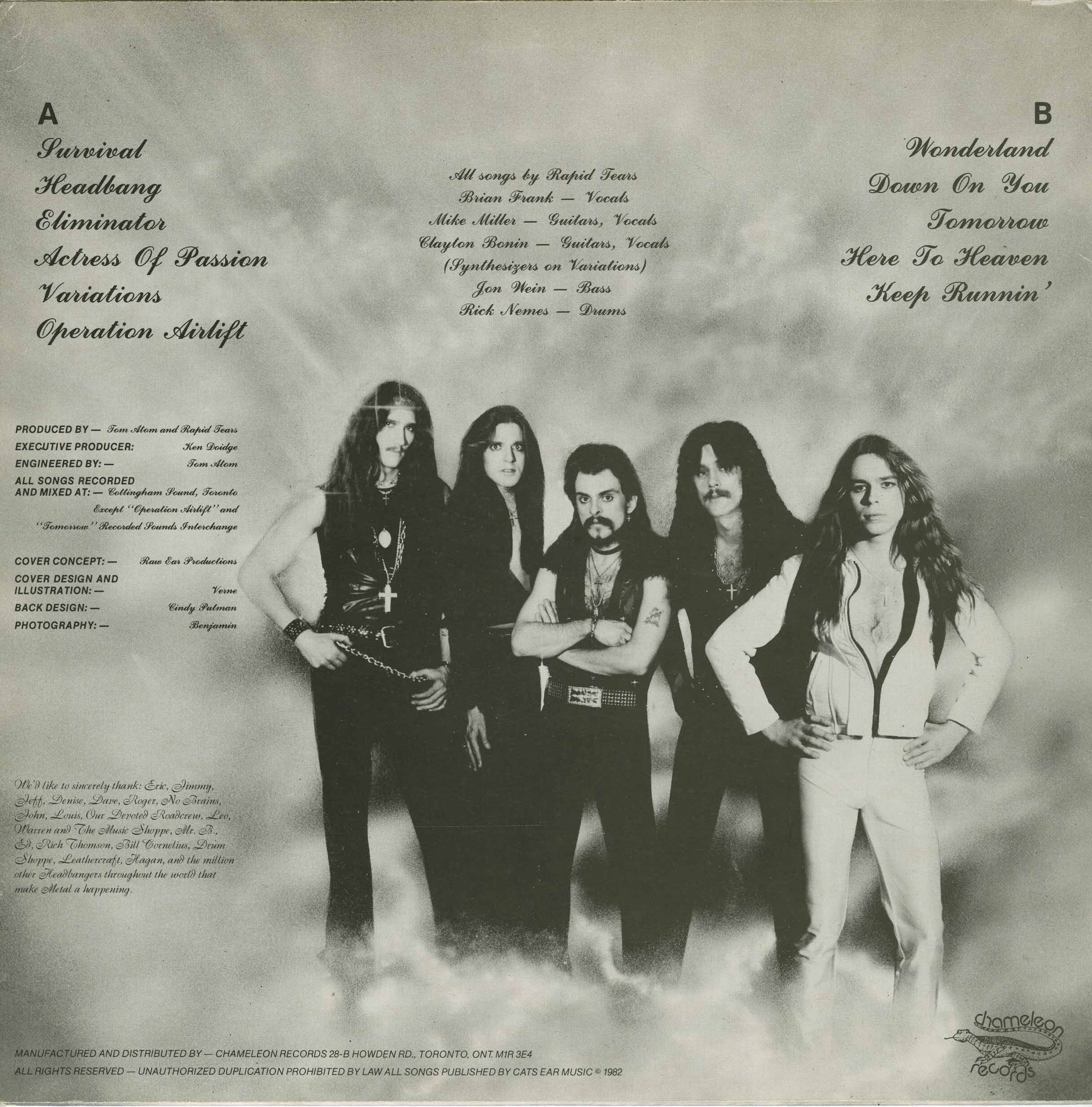 Rapid Tears were 'Canada's Heavy Assault', a five man heavy metal band who formed in 1977 in Toronto, Ontario. They released their first album, 'Honestly' with two different covers, on Chameleon Records CR-575. That album created an overwhelming wave on the European front. Rapid Tears followed up two years later, in 1984 with the four track EP 'Cry for Mercy' on Chameleon Records CR 737. The band disbanded shortly thereafter.