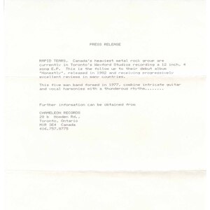 Chameleon Records was a small independent label that was operated by Carlene Osborne, at 28b Howden Rd, in Toronto, Ontario. They were a self-contained organization dedicated to exposing and promoting Canadian talent. Besides the 2 Rapid Tears releases, they also released Honey Novick and Chris Henderson on WRC1-930; Honey Novick and Friends-Fortune Baby on CR-777; Music for Subways: Toronto's subway musicians in the studio on OM-233; The Circuit-ST LP on CR-555; Neon 7" on CR0757; Instructions 7" on CR-355; Cold War 7" on CR-532; and No Pedestrians comp LP on CR-535; Pale Blue 7" on CR 001.